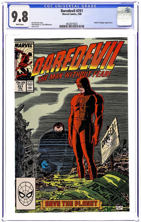 Cover pencils by John Romita, Jr., inks by Al Williamson. Save The Planet!, script by Ann Nocenti, pencils by John Romita, Jr., inks by Al Williamson; Bullet frames an ecology group for murder at Kelco Industries and DD tracks him down and tries to make him pay; With the government and the Kingpin on his side, Bullet goes free. 36 pgs. Cover price $0.75. Cover price $0.75.