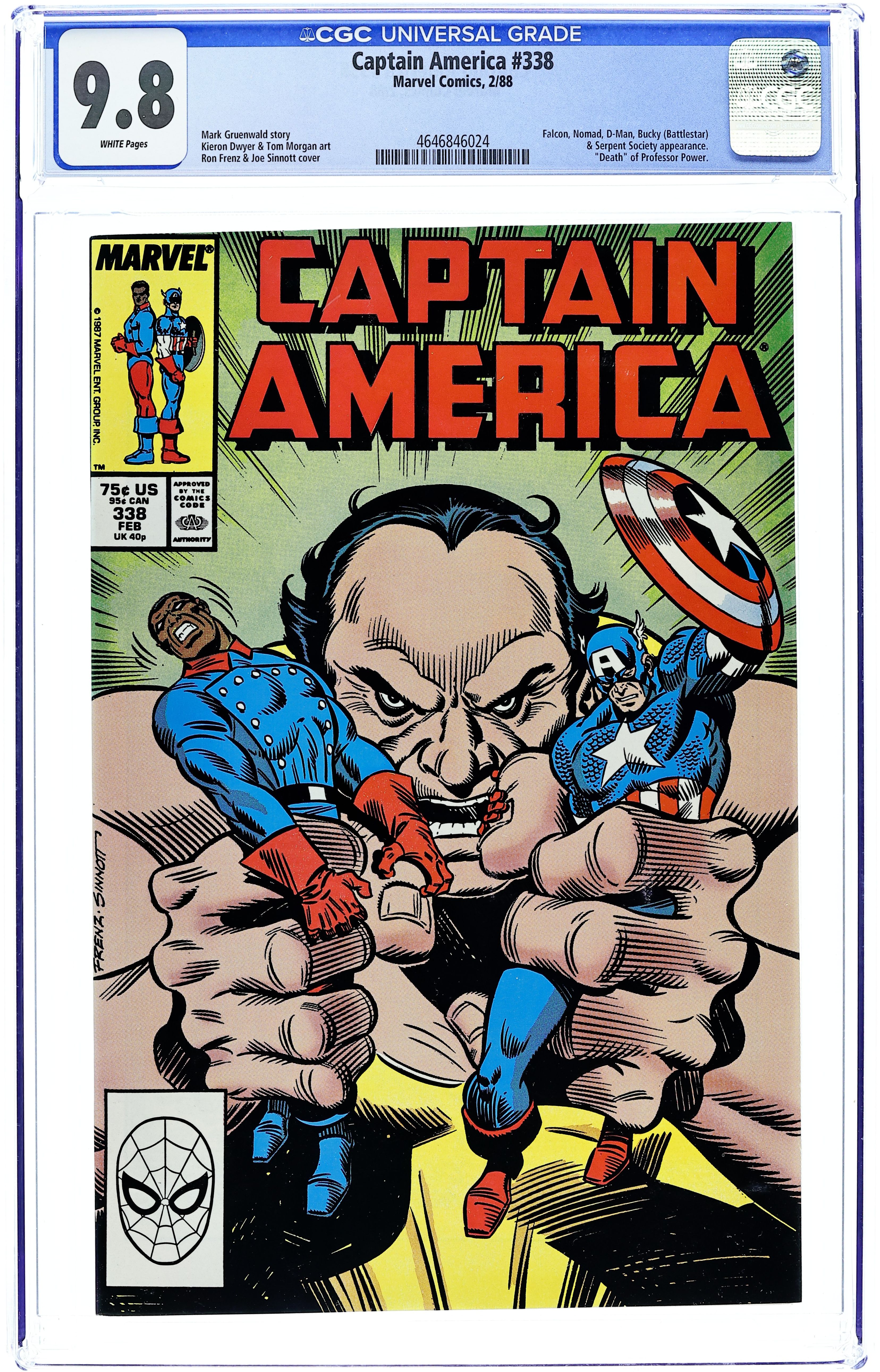 "Power Struggle" Story by Mark Gruenwald. Art by Kieron Dwyer and Tom Morgan. Cover by Ron Frenz and Joe Sinnott. The next assignment for Captain America (aka John Walker) and Bucky sends the duo to upstate New York to locate Anthony Power, formerly known as Professor Power. Meanwhile across the country, the Captain, D-Man, Falcon, and Nomad are stuck behind bars in Las Vegas. What will the foursome do when Sidewinder teleports into the jail to free his Serpent Society compatriots? 36 pages Cover price $0.75.