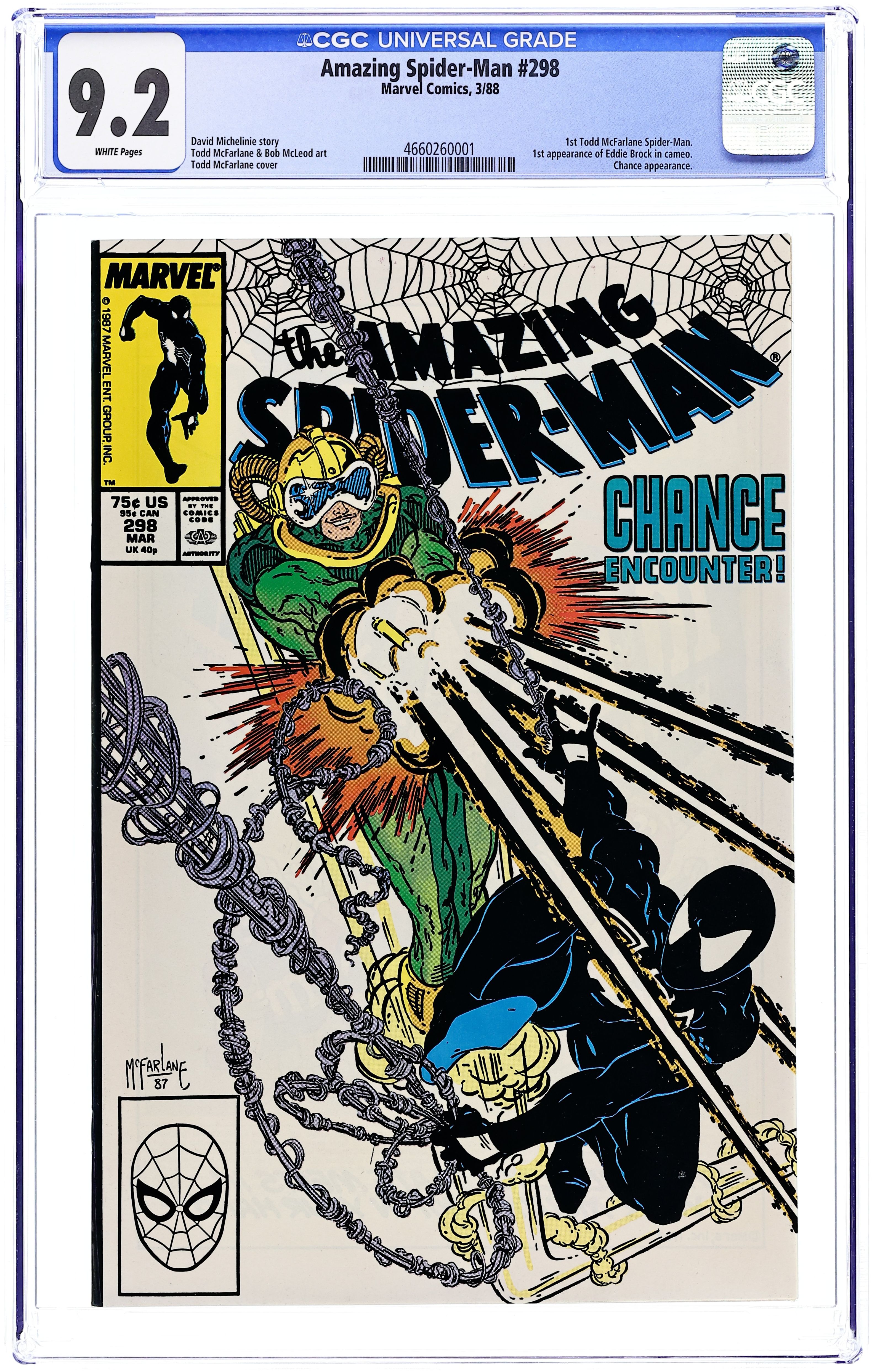 Direct Edition. "Chance Encounter!" Part 1 of 2. Script by David Michelinie. Pencils by Todd McFarlane. Inks by Bob McLeod. Cover by Todd McFarlane. Chance is back in business and working a new job for the Life Foundation! The clandestine organization wants Chance to steal an arms shipment coming into the west side docks! That should be a piece of cake for the high-flying mercenary! However, the Daily Bugle dispatches an undercover photographer to observe the delivery! And beneath the moonlit sky, fireworks explode when Chance and the Amazing Spider-Man throw down on the docks! First appearance (and cameo on the last page) by Eddie Brock (aka Venom). First appearance of Carlton Drake of the Life Foundation. Cameo appearances by Mary Jane Watson, Joy Mercado, and Joe Robertson. (Notes: Chance previously appeared in Web of Spider-Man 15. This issue begins Todd McFarlane's 2-year run as the penciler of the Amazing Spider-Man series.) 36 pages. Cover price $0.75.