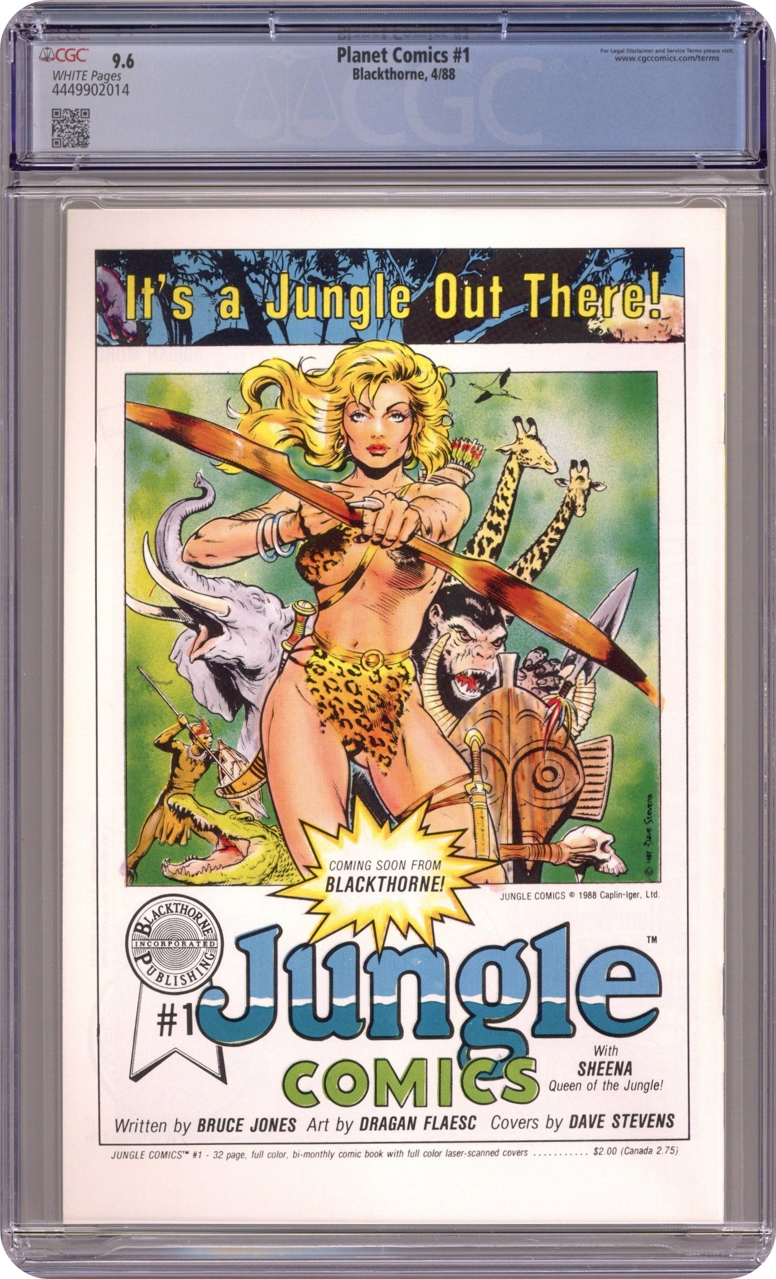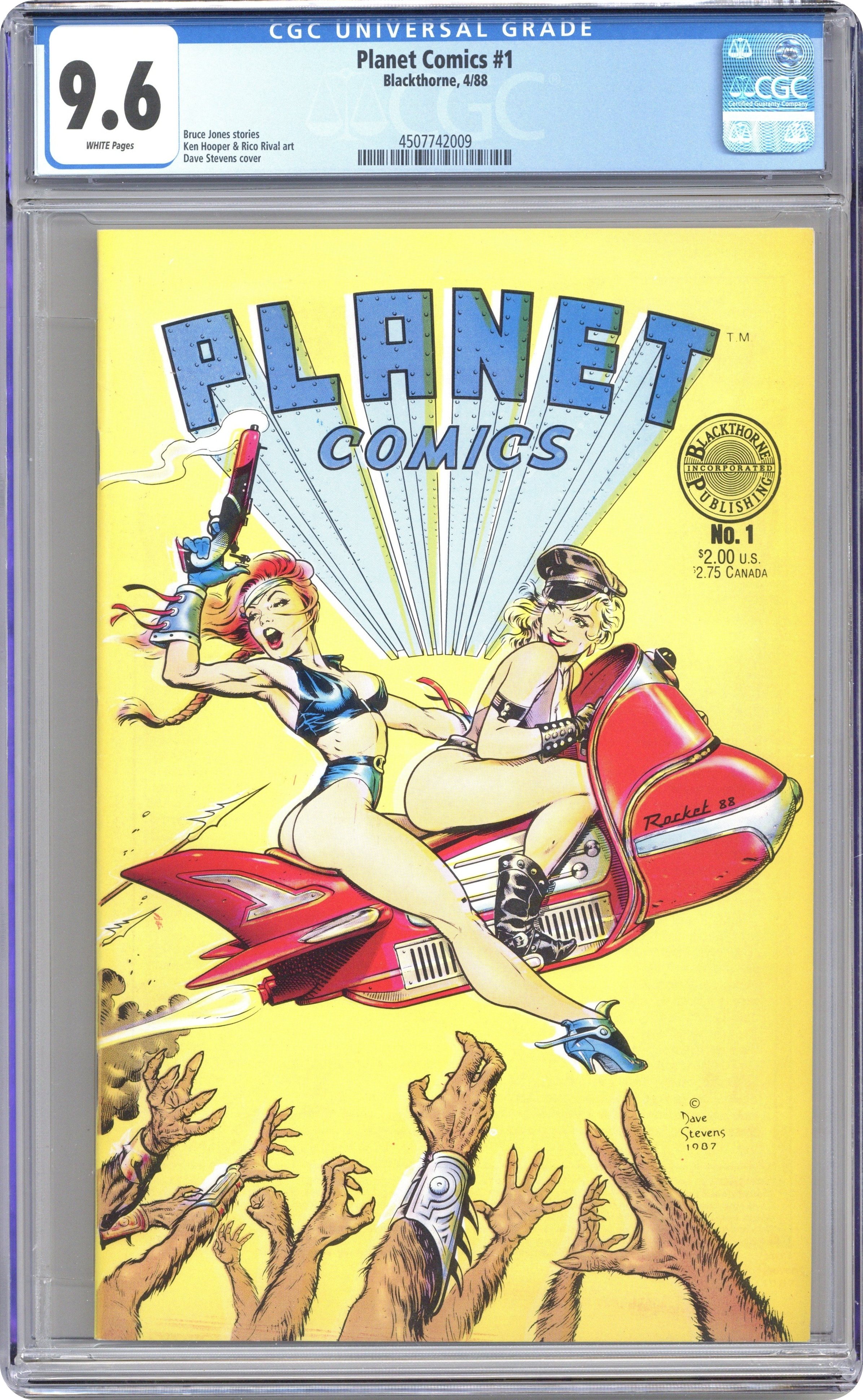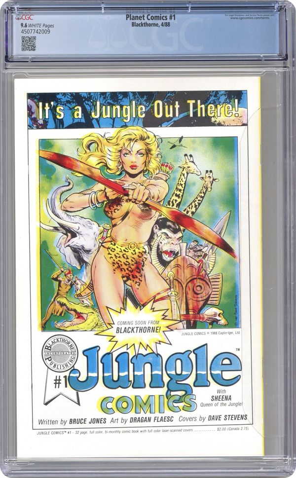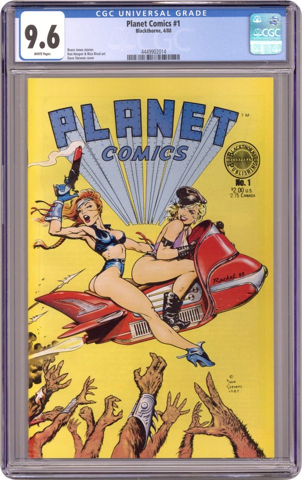 Stories by Bruce Jones. Art by Adrian Moro, Ken Hooper and Rico Rival. Cover by Dave Stevens. Blackthorne Publishing resurrects the original Planet Comics title published by Fiction House in the 1940s-50s. Writer Bruce Jones even revives Matt Baker's gypsy adventurer, Flamingo, and original Planet Comics heroes Bowman and Lyssa, Queen of the Lost World, battling the reptilian Voltamen to free Earth. Featuring a great cover by beloved good-girl artist (and Rocketeer creator) Dave Stevens. Hunt Bowman in The Lost World; Flamingo; Secret Circle. 32 pages, Full Color. Cover price $2.00.