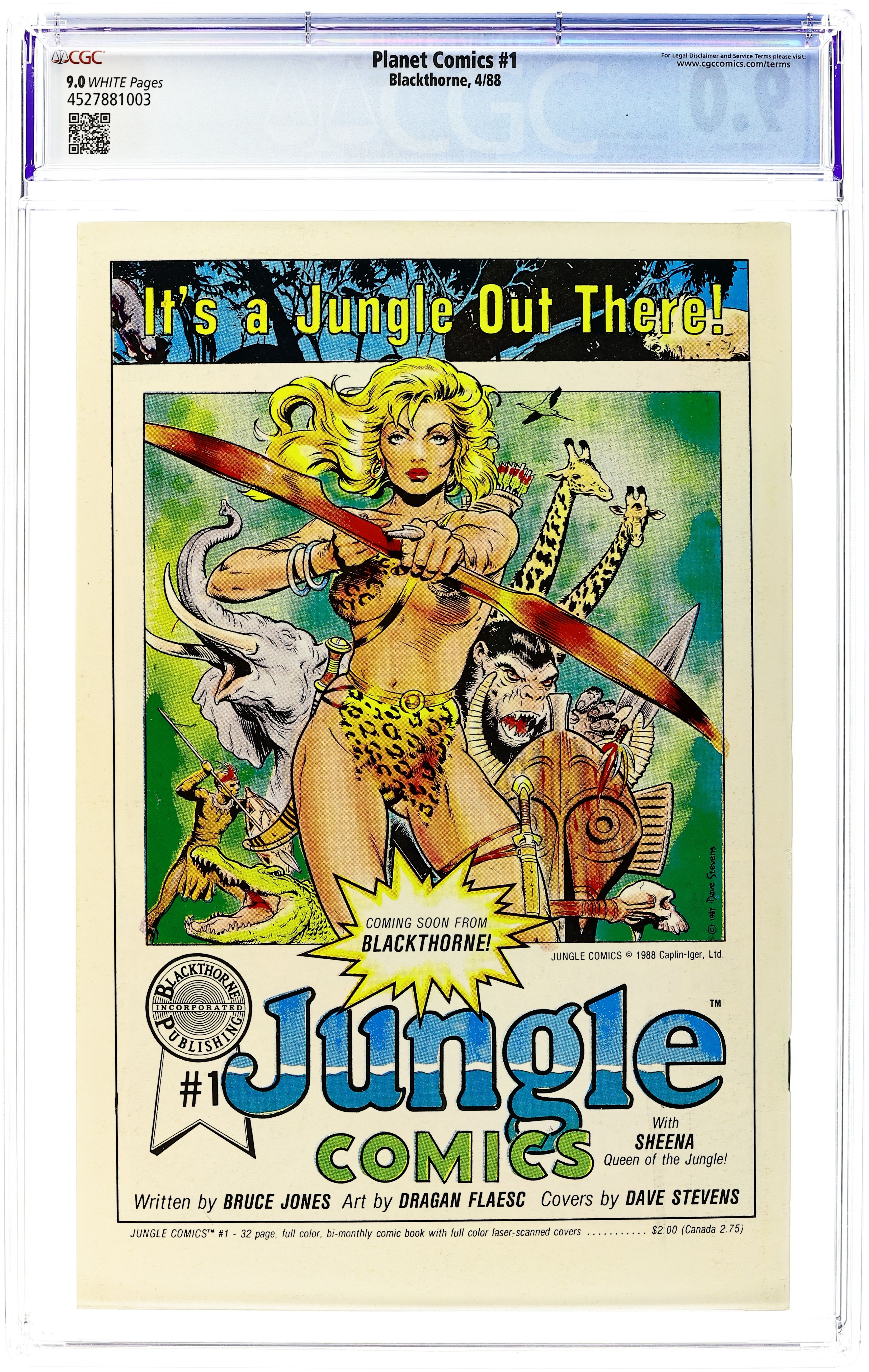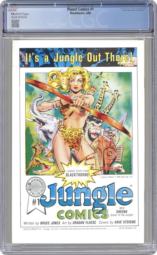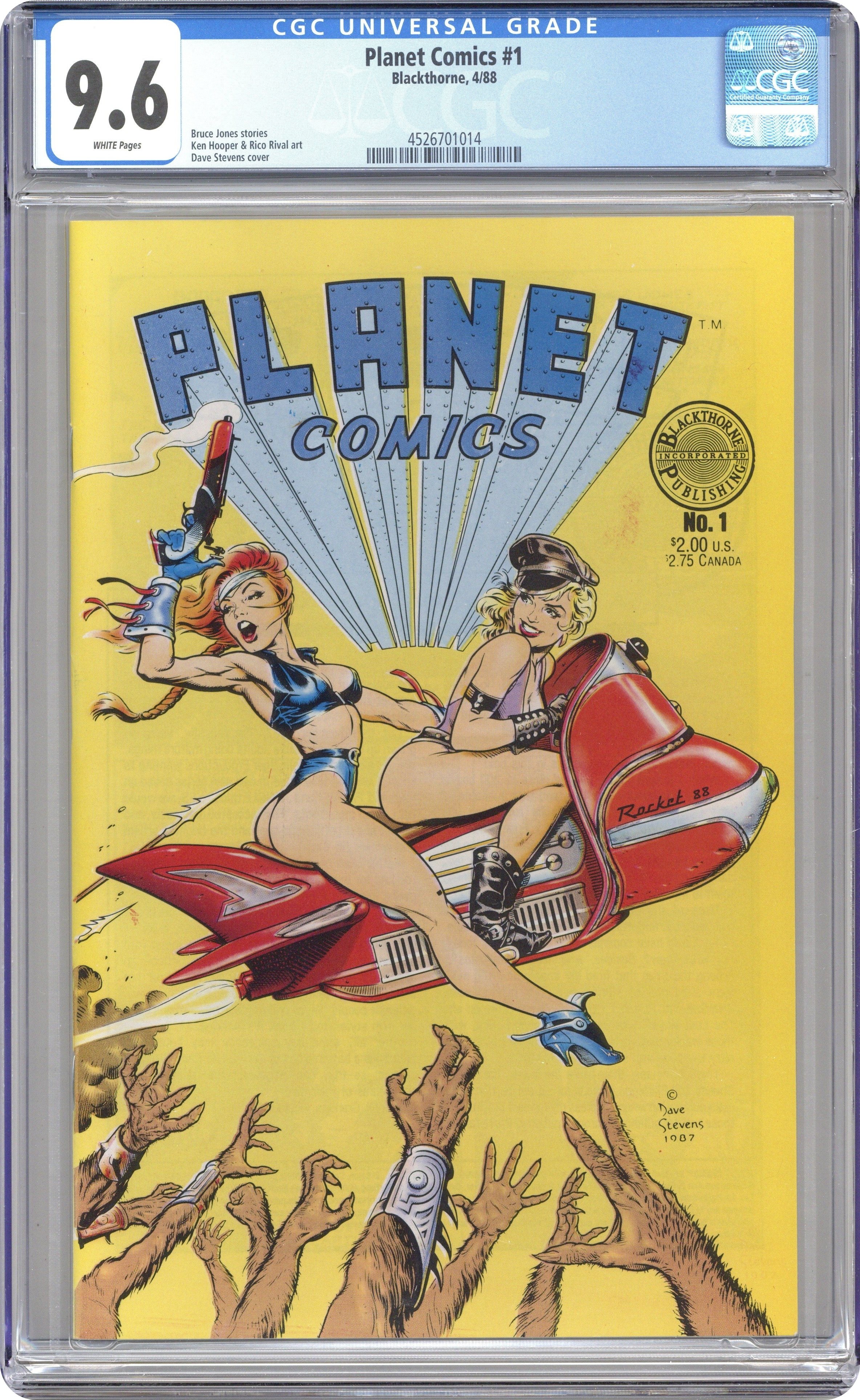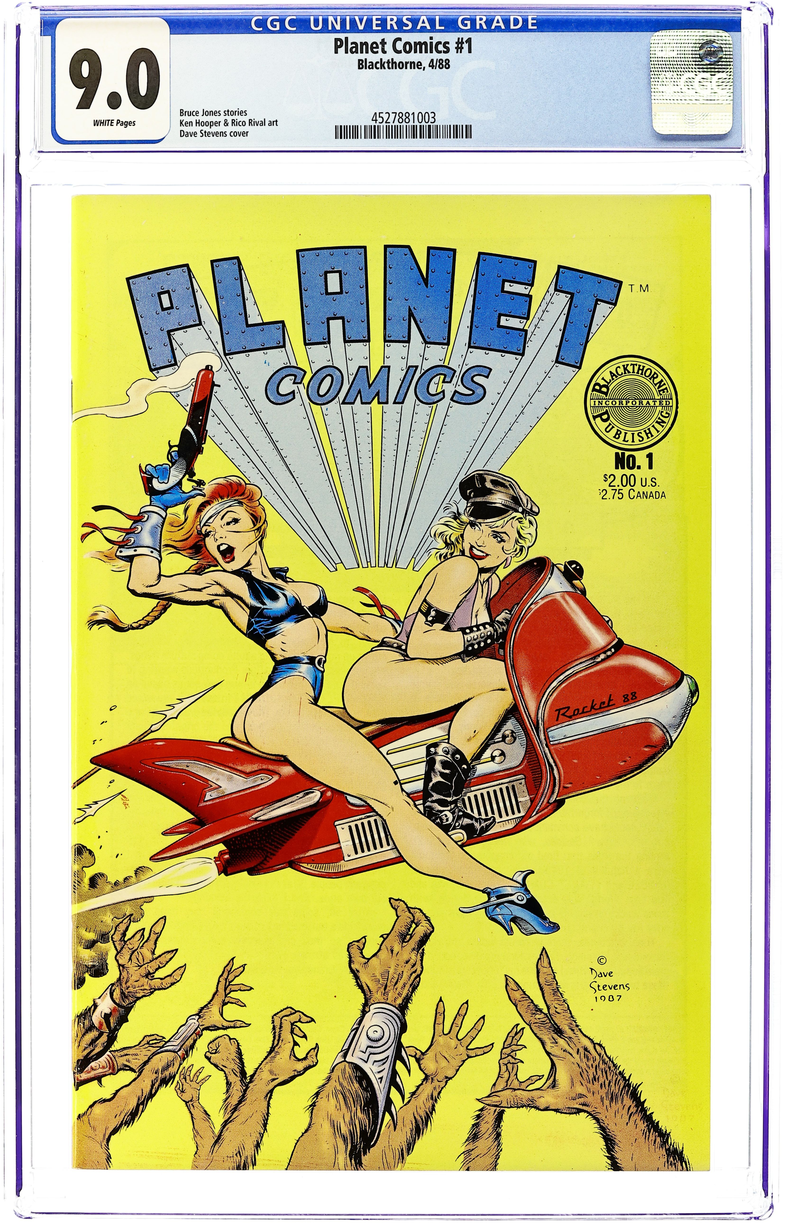Stories by Bruce Jones. Art by Adrian Moro, Ken Hooper and Rico Rival. Cover by Dave Stevens. Blackthorne Publishing resurrects the original Planet Comics title published by Fiction House in the 1940s-50s. Writer Bruce Jones even revives Matt Baker's gypsy adventurer, Flamingo, and original Planet Comics heroes Bowman and Lyssa, Queen of the Lost World, battling the reptilian Voltamen to free Earth. Featuring a great cover by beloved good-girl artist (and Rocketeer creator) Dave Stevens. Hunt Bowman in The Lost World; Flamingo; Secret Circle. 32 pages, Full Color. Cover price $2.00.