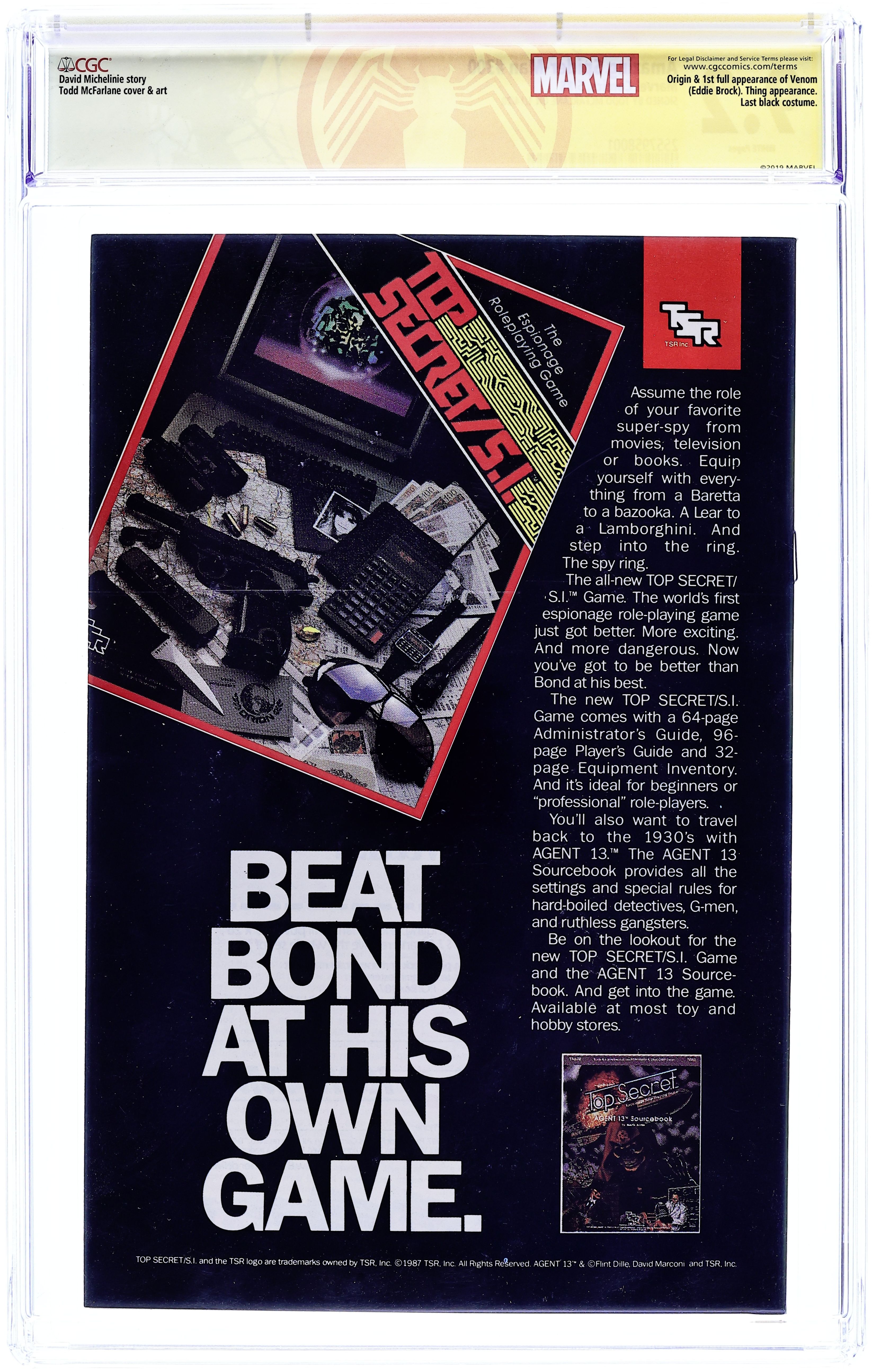 Direct Edition. Giant-sized 25th anniversary issue. First full appearance of Venom in "Venom!", script by David Michelinie, art by Todd McFarlane; Spidey's old alien costume has merged with reporter Eddie Brock who thinks his career was ruined by Spider-Man and the symbiote of the two, Venom, takes on the web slinger; At MJ's request, Spidey returns to the blue and red costume as she now finds his black duds way too creepy; This is the last issue in which Spider-Man appears in his black costume; Thing (of the Fantastic Four) cameo.. Stan's Soapbox Special in place of letters page: Full page editorial by Stan on the occasion of Spider-Man's 300th issue. 52 pgs., full color. Cover price $1.50.