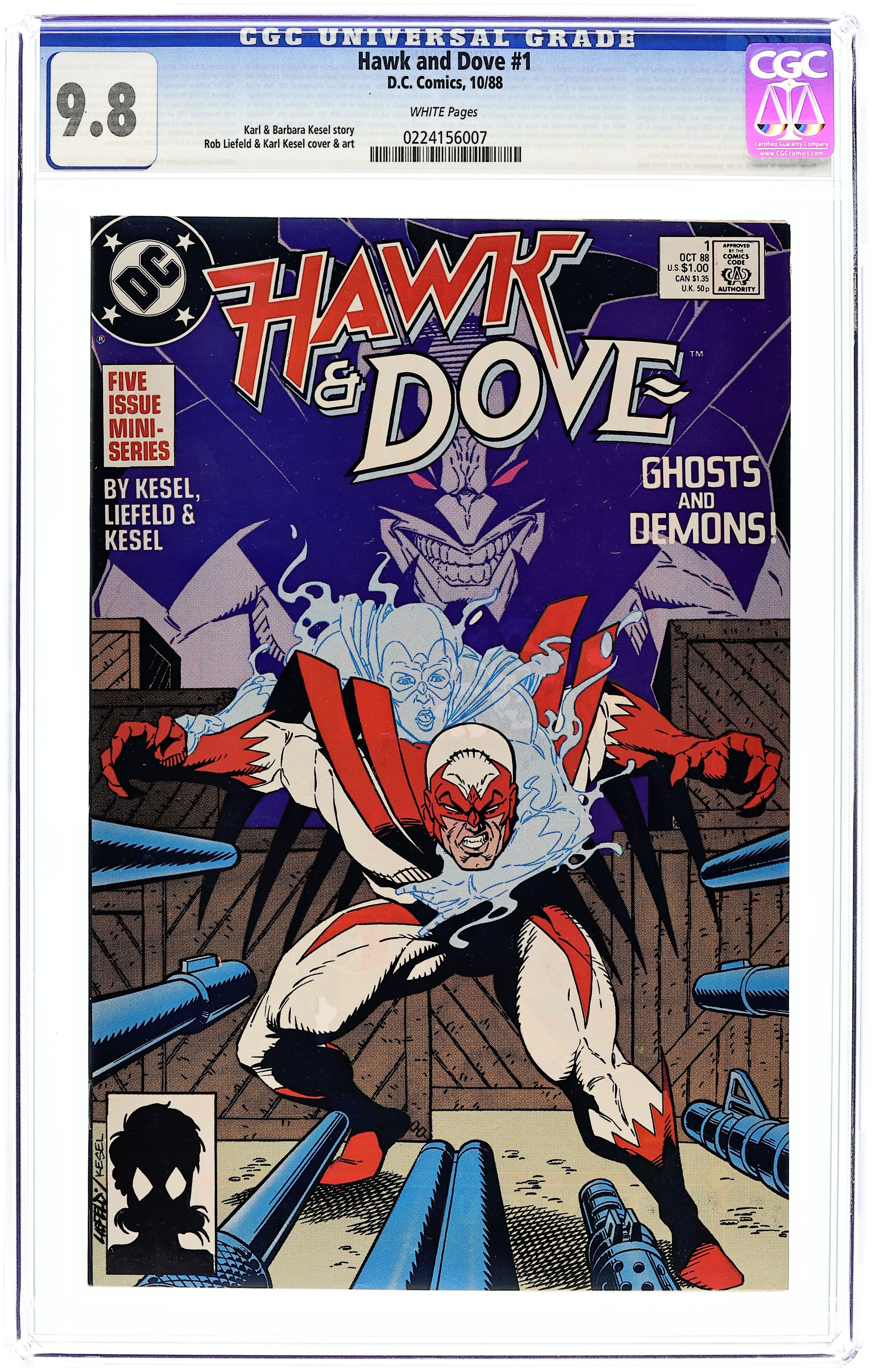 1st appearance of Dove as a female character. Rob Liefeld art. "Ghosts and Demons!" His brother, Dove, is dead. The Teen Titans have thrown him off the team. Hawk is a man living on the edge...and just about anything can give him the push that will send him tumbling over into the abyss. HAWK & DOVE is the story of this man...and of the person chosen by the fates and the forces of Order to become his new partner, Dove. Hawk has drifted in his turmoil since Dove died, but now as the battle heats up between the Lords of Order and Chaos, he realizes that only Dove can save him from giving in to his bestial nature...if he can be saved at all. Co-written by Barbara Kesel and Karl Kesel, with art by Rob Liefeld and Karl Kesel. Cover by Liefeld and Karl Kesel. Cover price $1.00.