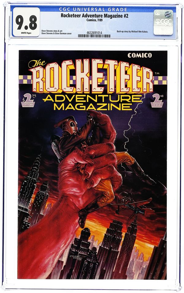 Cover by Dave Stevens and Dave Dorman. "Nightmare at Large." 14 pages. Part 7 of 8. Story by Dave Stevens, Paul DeMeo and Danny Bilson. Layouts by Mike Kaluta. Art by Dave Stevens. Cliffs shadowy new colleague sends him on a mission to track down a killer who is murdering members of a circus troupe Cliff once belonged to. "Pitcairns Autogiro." 3 pages. Text feature. "All Souped Up and Nowhere to Blow." 10 pages. Story by Elaine Lee. Art by Michael Kaluta. Hi-jinks abound as the Galactic Girl Guides prepare their entry for the Soup Can Rally. All the while making sure those dumb Boy Scouts dont steal their ideas. 32 pages. Full color. Cover price $2.75.