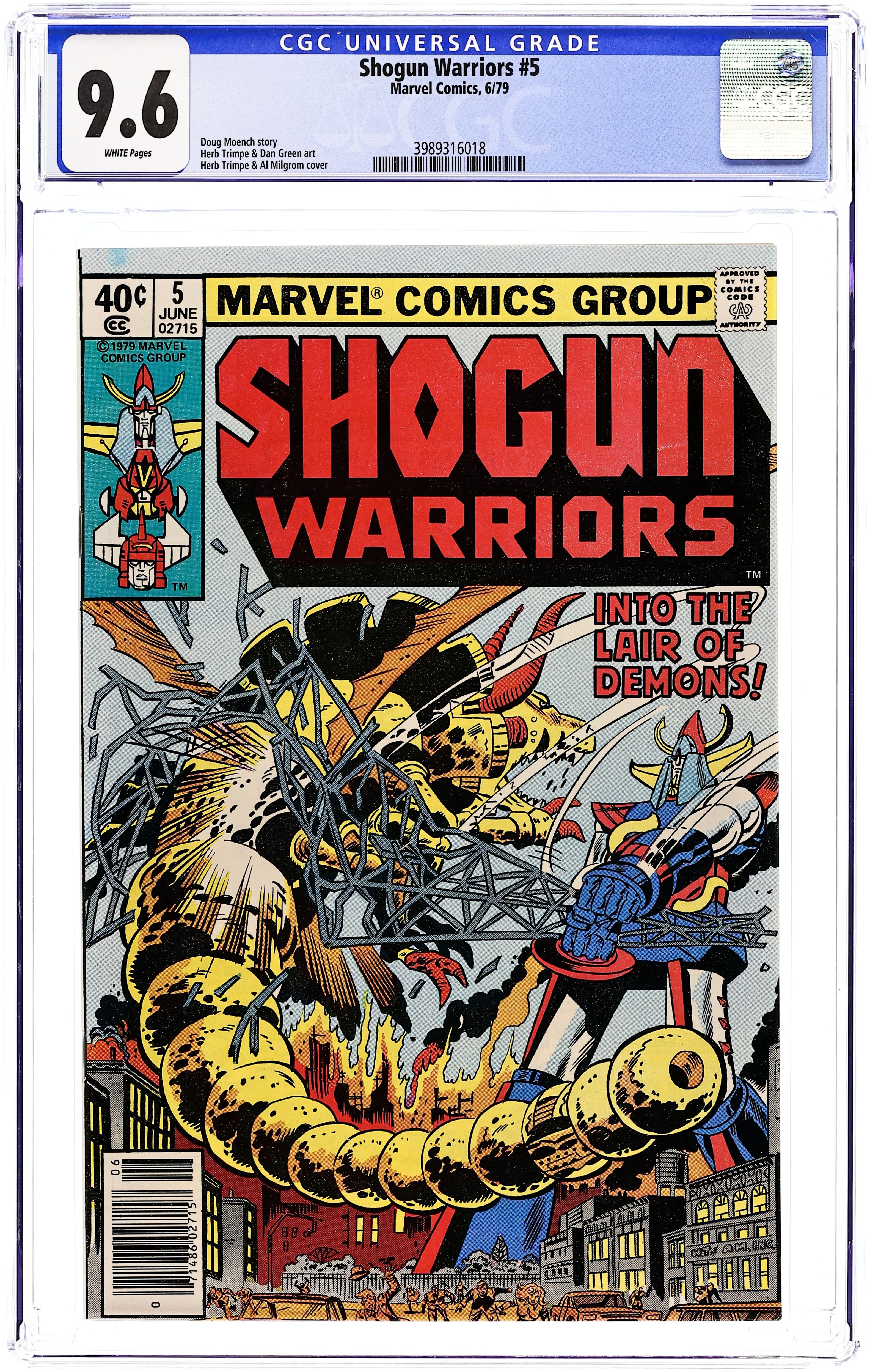 Part 5 of 6 - "Into the Lair of Demons!" Story by Doug Meonch. Art by Herb Trimpe and Dan Green. The Shogun Warriors fight against all odds to save the lives of thousands. Meanwhile, a traitor may cause the death of a team member. Cover price $0.40.