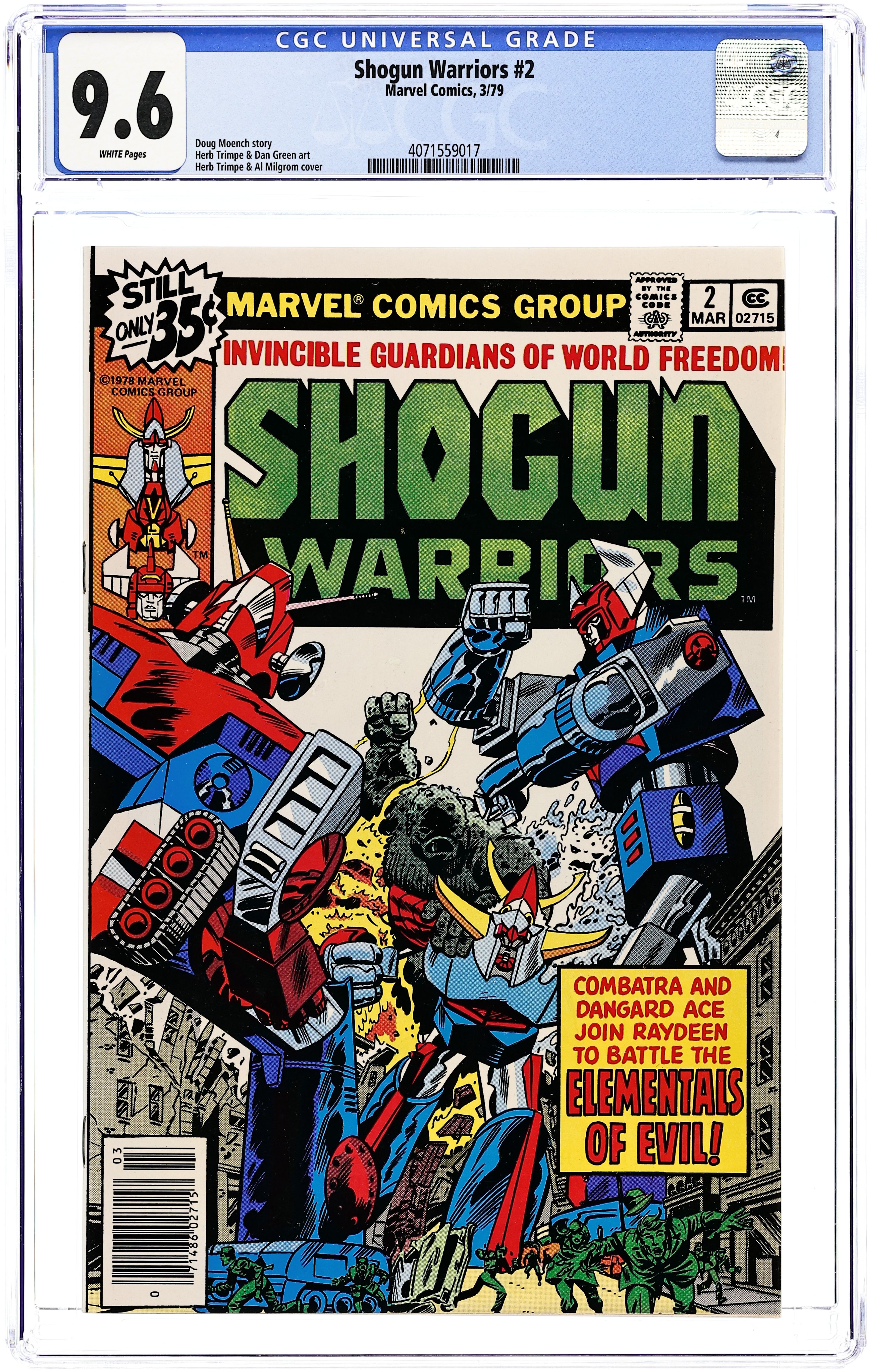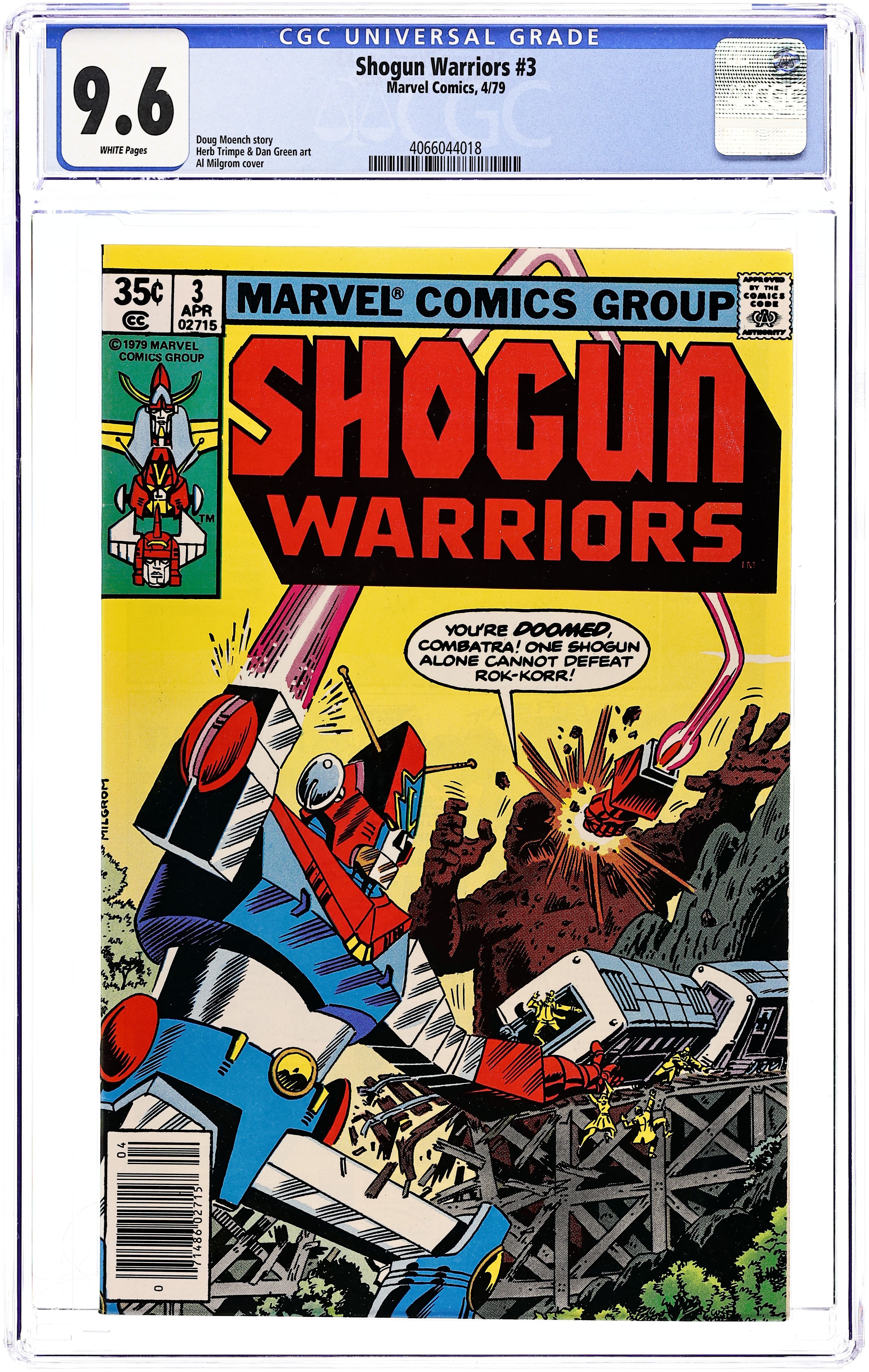 Part 2 of 6 - "Warriors Three!" Story by Doug Meonch. Art by Herb Trimpe and Dan Green. Two brave men and a woman have been recruited to pilot the giant robots known as the Shogun Warriors. The first of these warriors, Raydeen, battled and thought he had defeated the colossal Rok-Korr. But he soon learned that the monster had become even more powerful than before.. Now, Raydeen will be joined by Combatra and Dangard Ace, and if they fail....the world is doomed! 32 pages, FC Cover price $0.35.