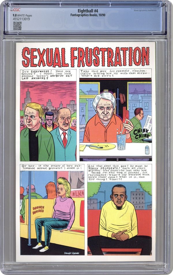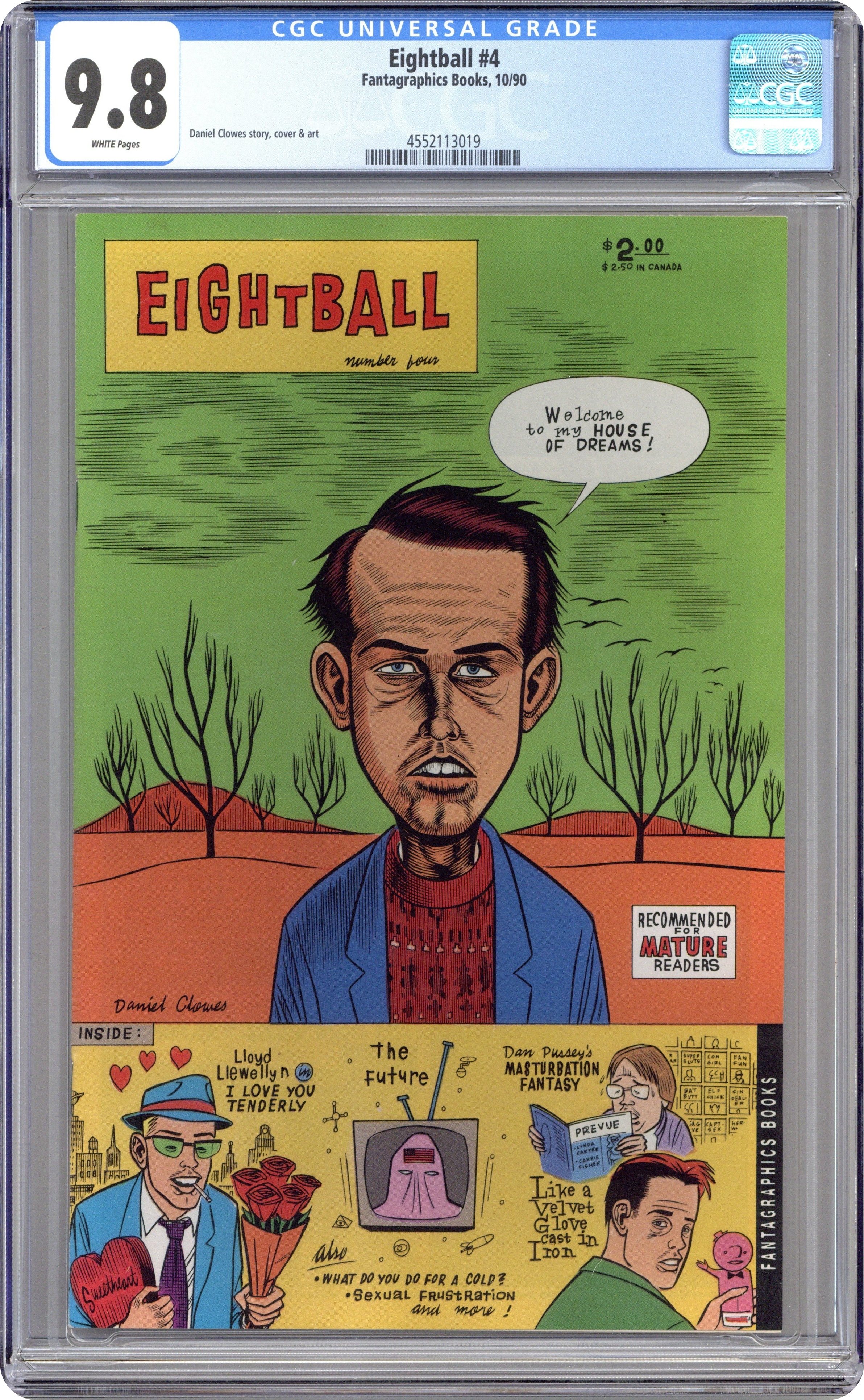 Cover art by Daniel Clowes. What Do You Do For A Cold?; adapts answers given by people in an old folks home and originally published in Duplex Planet. Part Four--Like A Velvet Glove Cast In Iron; Clay meets a conspiracy theorist that helps his search. I Love You Tenderly starring Lloyd Llewellyn; starts as a list of favorite people, then descends into another rant against people. Dan Pussey's Masturbation Fantasy. The Future; crazy predictions about the future. Scripts and art by Daniel Clowes. 28 pgs. $2.00. Cover price $2.75.