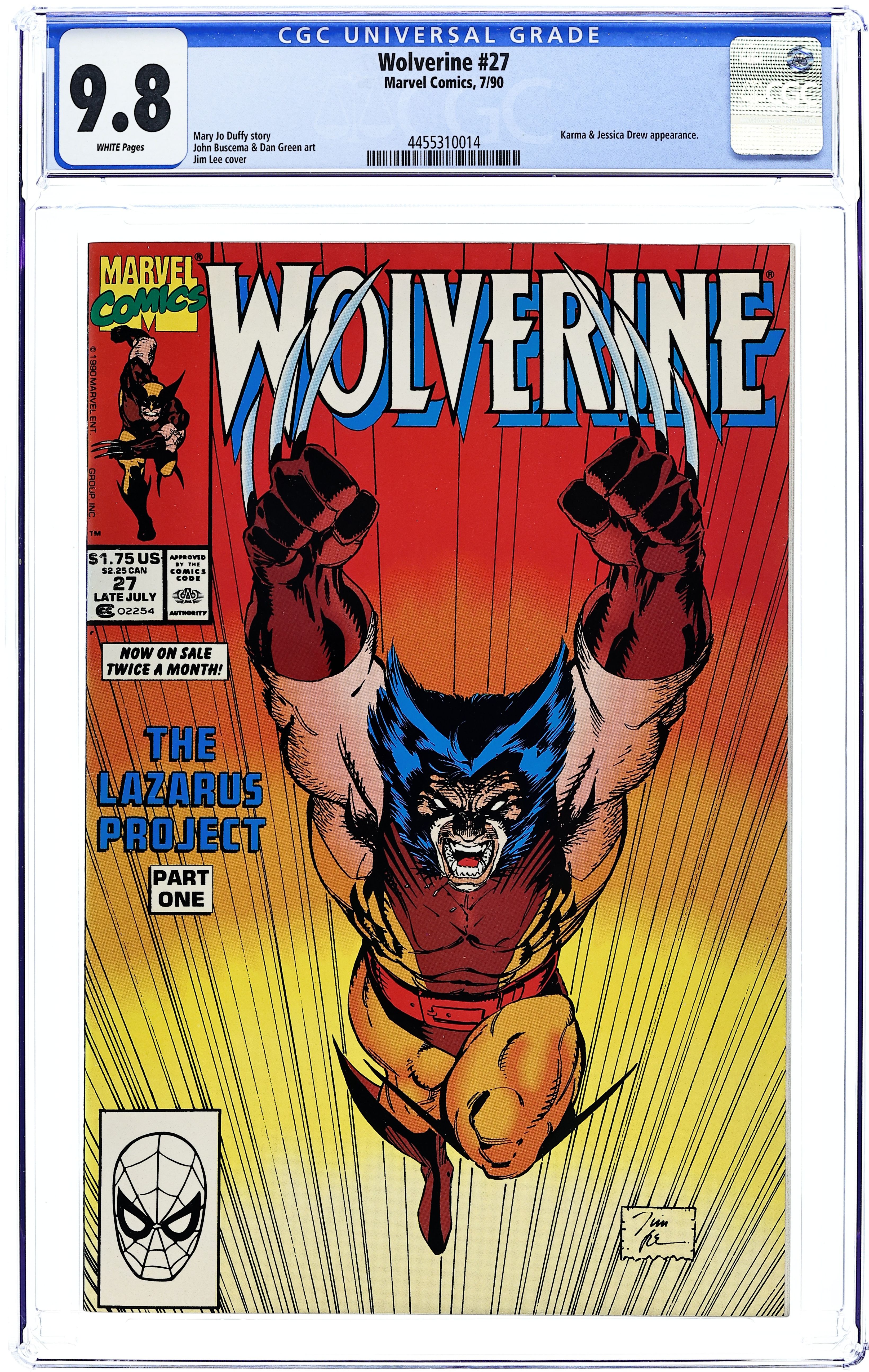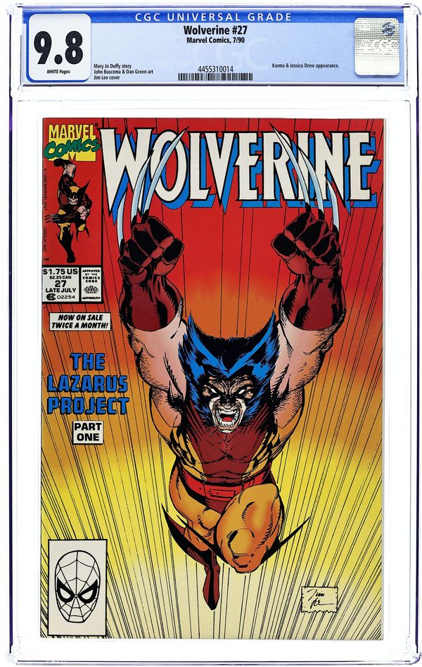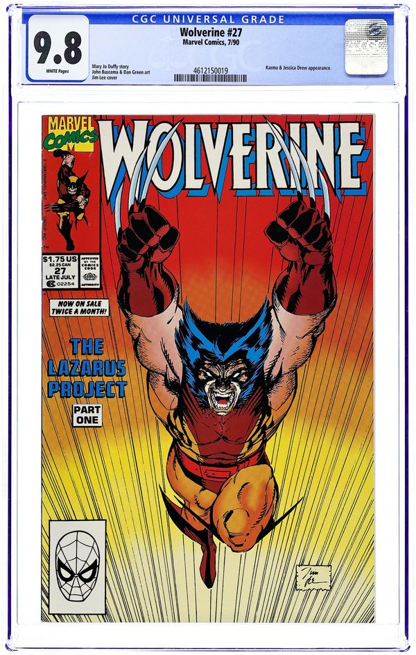 Direct Edition. The Lazarus Project: Part 1 of 4 - "Predators and Prey!" Written by Jo Duffy. Art by John Buscema and Dan Green. Cover by Jim Lee. A mysterious broker makes a deal with Coy to complete the nefarious Lazarus Project. Meanwhile, deep inside the Baron's palace, Wolverine and Jessica Drew discover brand new threat. 32 pages, FC Cover price $1.75.