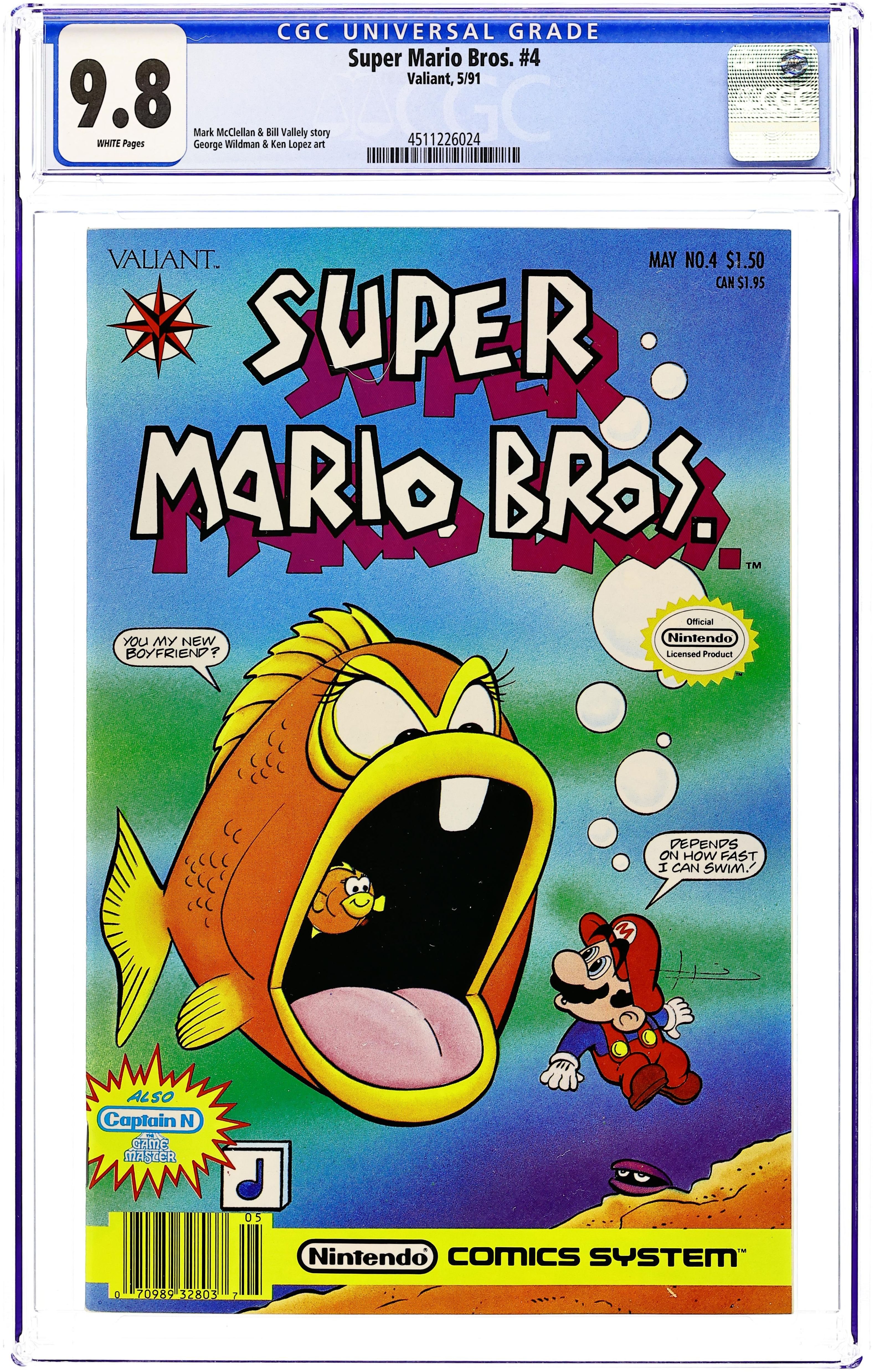 Story and art by Bill Valley, Mark McClellan, George Wildman, P. Zorito, Ken Lopez, and The Gradations. While on a mission for the princess in the ocean, Mario encounters Bertha, a fish who believes him to be her newest boyfriend in "Love Flounders". Captain N back-up story. 32 pages. Full color. 1.50 cover price. Cover price $1.50.