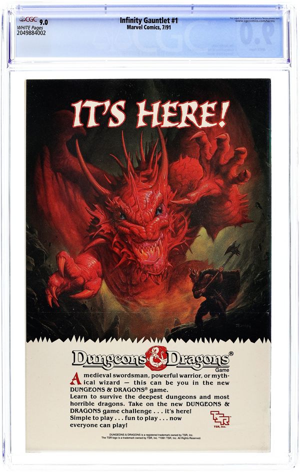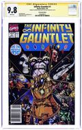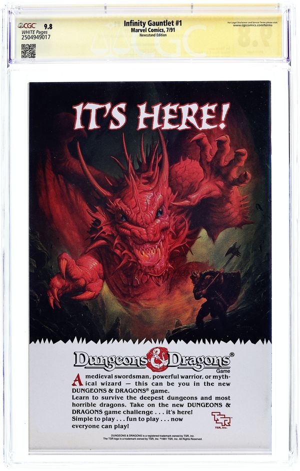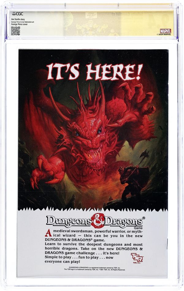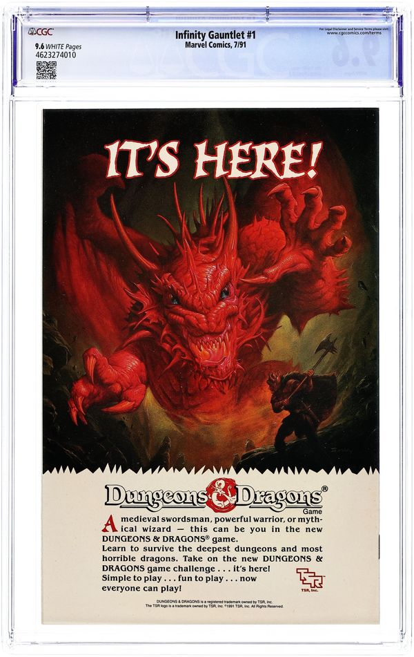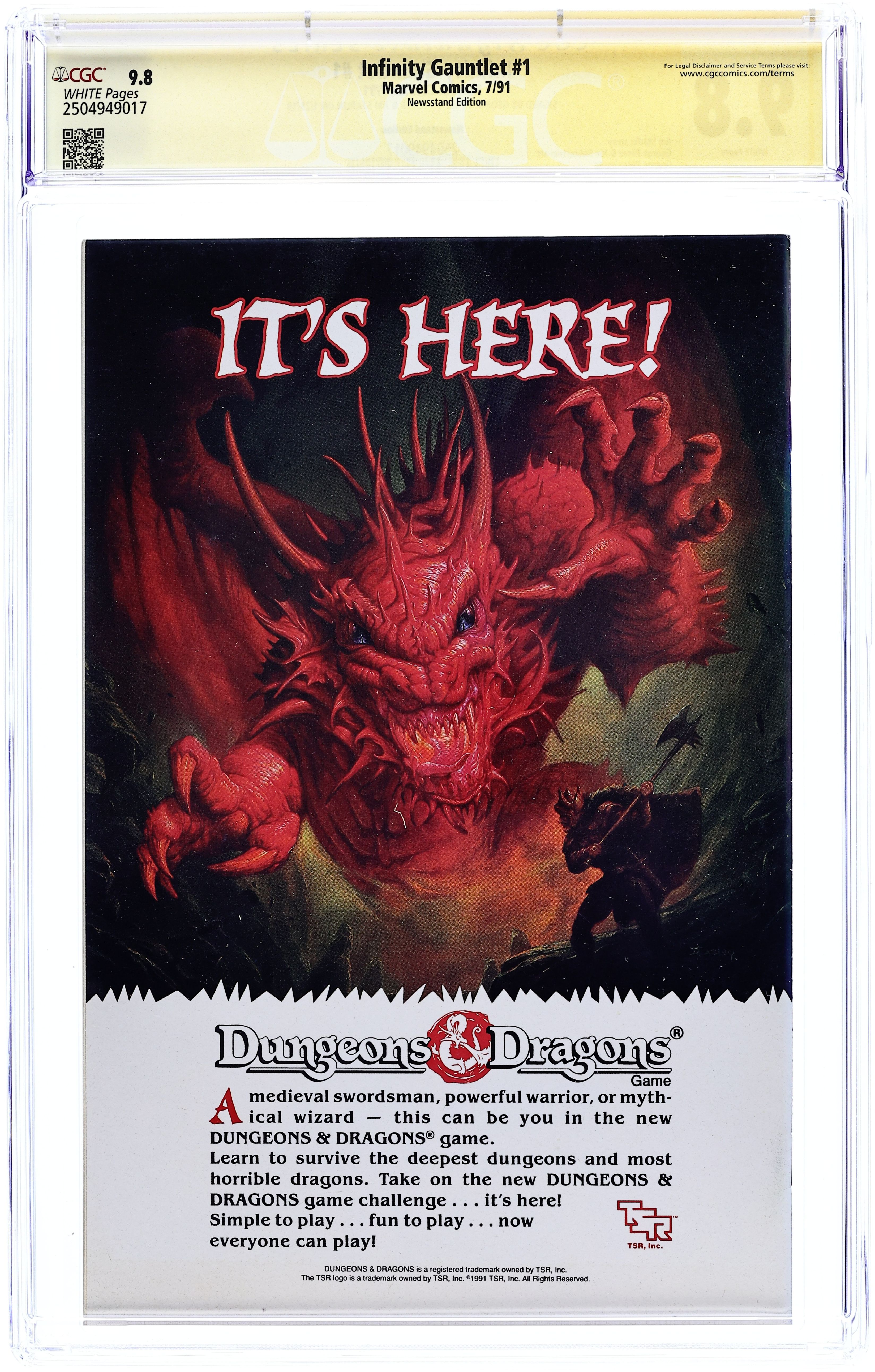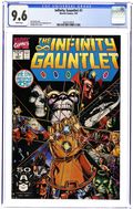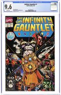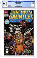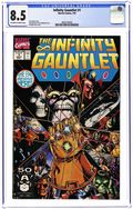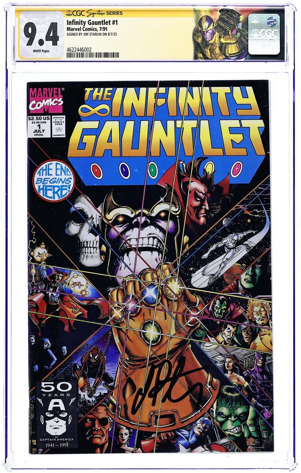 Direct Edition. Part 1 of 6. "God!" Story by Jim Starlin. Art by George Perez, Joe Rubinstein and Tom Christopher. Story continued from Thanos Quest #1-2 and Silver Surfer (1987-98 2nd Series) #50. The Silver Surfer crashes to earth and into the Sanctum Sanctorum of one Doctor Strange. The Sentinel of the Spaceways, barely alive after a grueling ordeal, arrives with the warning that the mad Titan, Thanos, has achieved ultimate power. Combining the Infinity Gems into the ominous Infinity Gauntlet, Thanos has become master of the mind, space, time, power, reality and the soul. And with his first act of nigh-omnipotent power Thanos eradicates half the population in the universe. Can the surviving heroes of Earth mount an offensive against this supreme power for evil and destruction, plus who are the mysterious new players who've just arrived on the scene? Cover price $2.50.