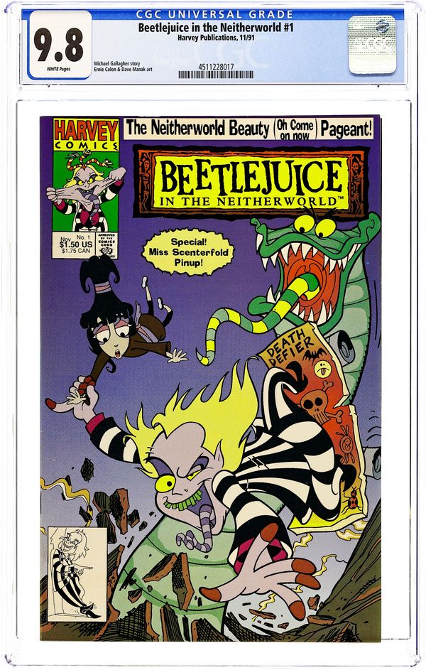 Stories and art by Michael Gallagher, Ernie Colon and Dave Manak. A revived Harvey, longtime publisher of Casper the Friendly Ghost, presents the most un-Casper-like ghost imaginable. The comic is actually based on the short-lived TV cartoon, based in turn on Tim Burton's first hit movie. Beetlejuice loves to scare people, but cute kid Lydia (played by Winona Ryder in the movie) just finds him goofy, and the two strike up a friendship. Beetlejuice shows Lydia what glamour is like in the afterworld. The Neitherworld Beauty (Youve Gotta be Kidding!) Pageant; Where the Ghouls Are; Miss Scenterfold. 32 pages, Full Color. Cover price $1.50.