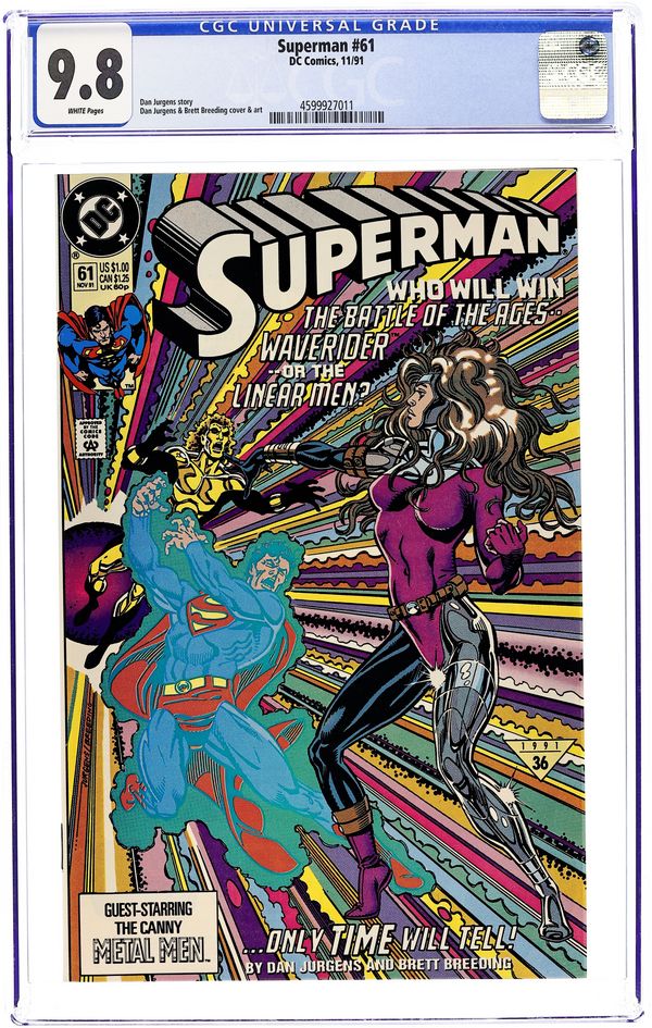 "Time and Time Again, Again!" Guest-starring the Metal Men. Story by Dan Jurgens. Art by Dan Jurgens and Eduardo Barreto. Superman has a tough decision to make. Is the mysterious Waverider attempting to destroy the time stream, or is he out to save many innocent lives from certain death. With the Linear Men hot on the golden time-traveler's trail, the Man of Steel does not have long to make up his mind. Cover price $1.00.