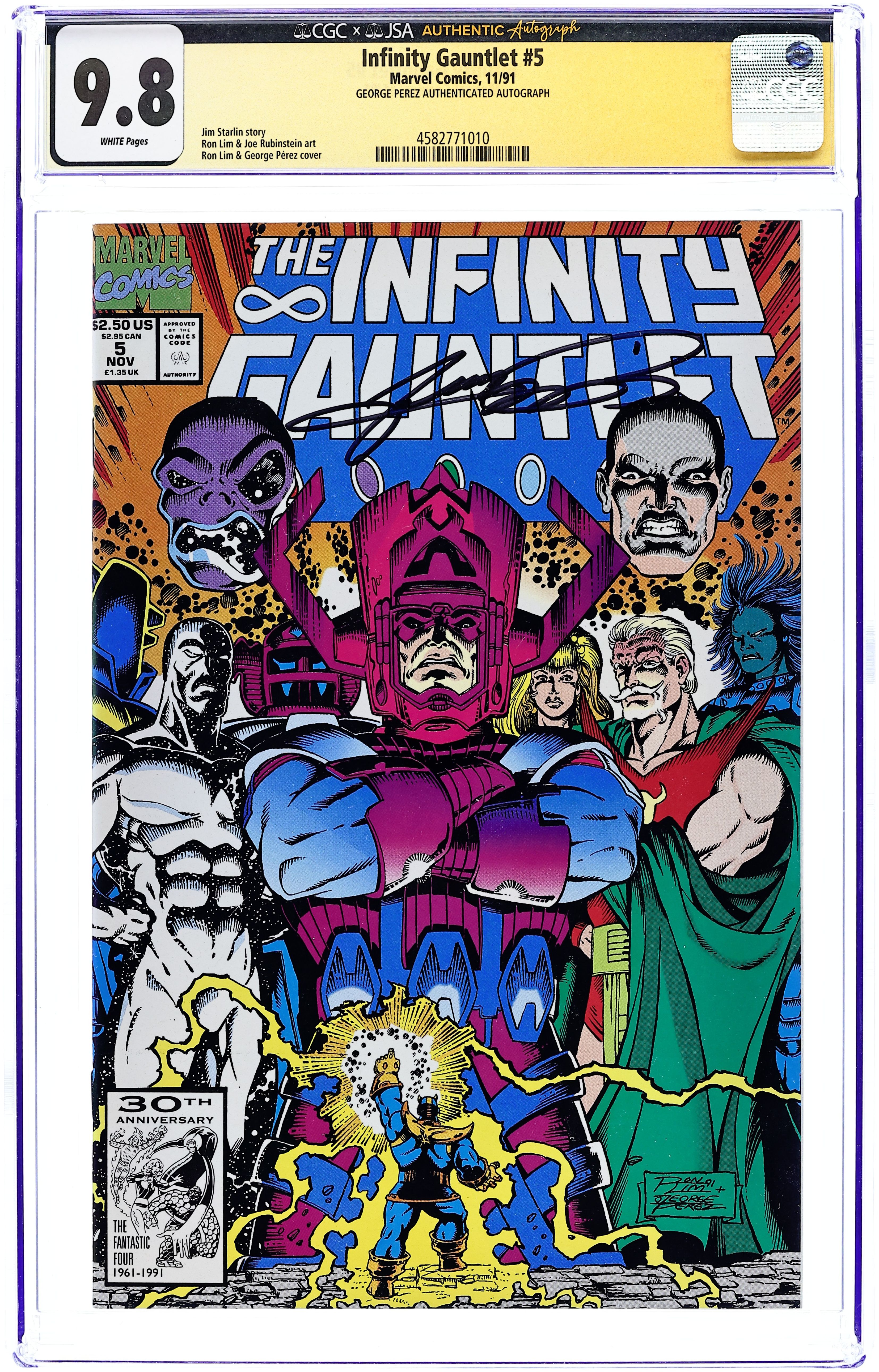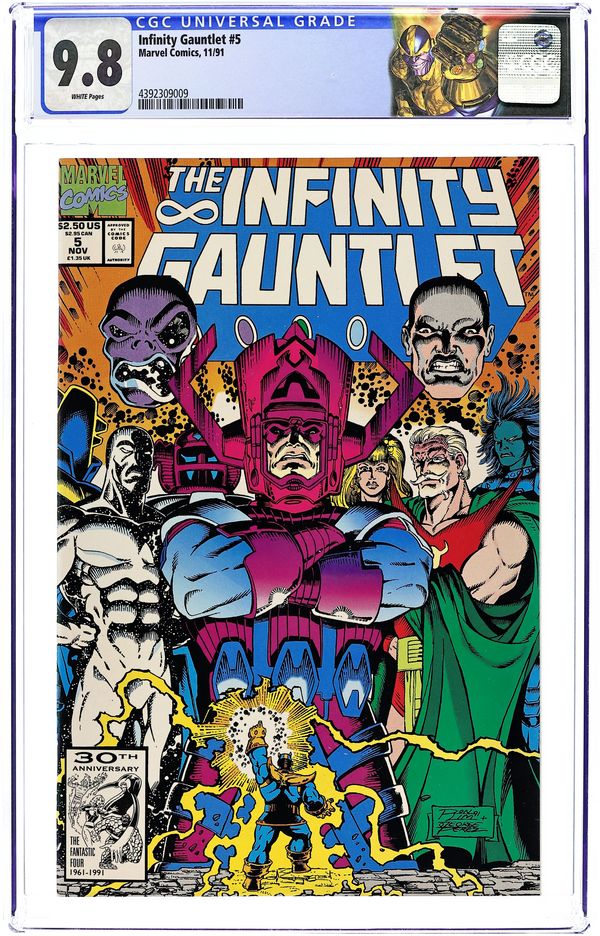 Infinity Gauntlet Crossover. "Field of Honor!" Guest-starring Adam Warlock, Doctor Strange, Hulk, Thor, Drax, Firelord, and Doctor Doom. Story by Ron Marz. Art by Tom Raney, Tom Christopher and Mike Witherby. Cover by Ron Lim. Story continued from Infinity Gauntlet #5. Nebula, the scared granddaughter of Thanos, is now in possession of the Infinity Gauntlet and she poses an even greater threat to the universe than the Mad Titan did. Now, the Silver Surfer and Thanos must settle their score in a mystical duel one of them may not survive. If one of them should fall so too might the universe. Story continues in Infinity Gauntlet #6. 32 pages. Cover price $1.00.