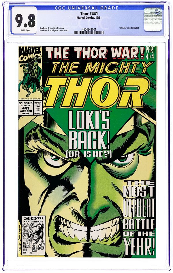 Cover pencils by Ron Frenz, inks by Al Milgrom. Loki takes on the present-day Thor, the future Thor (Dargo), and Beta Ray Bill in The Thor War part 4 of 4, "My Brother's Burden," script by Ron Frenz (plot) and Tom DeFalco (plot; script), pencils by Ron Frenz (layouts), inks by Al Milgrom (finished art); Loki easily bests the three pseudo-Thors; Thor II reverts back to Eric, but he has a secret; He tells Loki that he is destined to die at the hands of Thor; Loki races to Zarrko demanding to know the exact moment, so that he can defend against it; They fight and the Time Cube begins to break up; Zarrko is sucked into the time stream and Loki disappears. Tales of Asgard back-up, "If Death Be My Destiny!", script by Tom DeFalco, art by Patrick Olliffe; Balder frees Hela from the imprisonment that Lorelei had placed her; Hela traps the Destroyer and Lorelei in another dimension and reveals to Sif and Balder that the soul of Thor is not in her domain. Bullpen Bulletins. 36 pgs., full color. $1.00. Cover price $1.00.