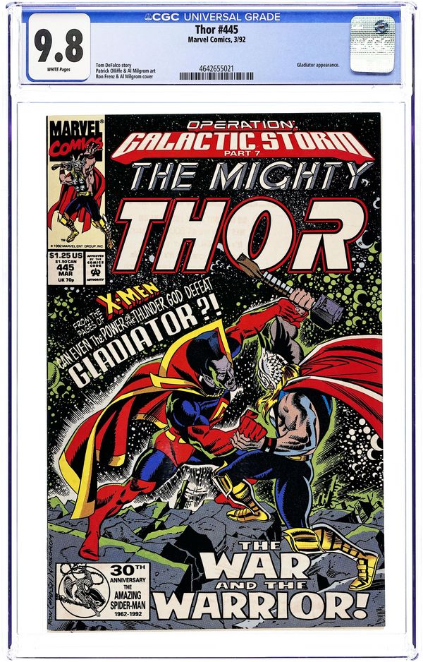 Cover pencils by Ron Frenz, inks by Al Milgrom. The Gladiator and the Avengers guest star in Operation Galactic Storm part 7, "The War and the Warrior!", script by Tom DeFalco, pencils by Patrick Olliffe, inks by Al Milgrom; Thor and his companions arrive in Shi'ar space but find themselves in the vicinity of an attack by a Kree starship; Gladiator mistakes them for the attackers and battles the Avengers; Thor winds up defeating Gladiator but has to destroy their only route home to do so. Bullpen Bulletins. The letters page contains a statement of ownership: average print run 256,992; average paid circulation 164,708. 36 pgs., full color. $1.25. Cover price $1.25.