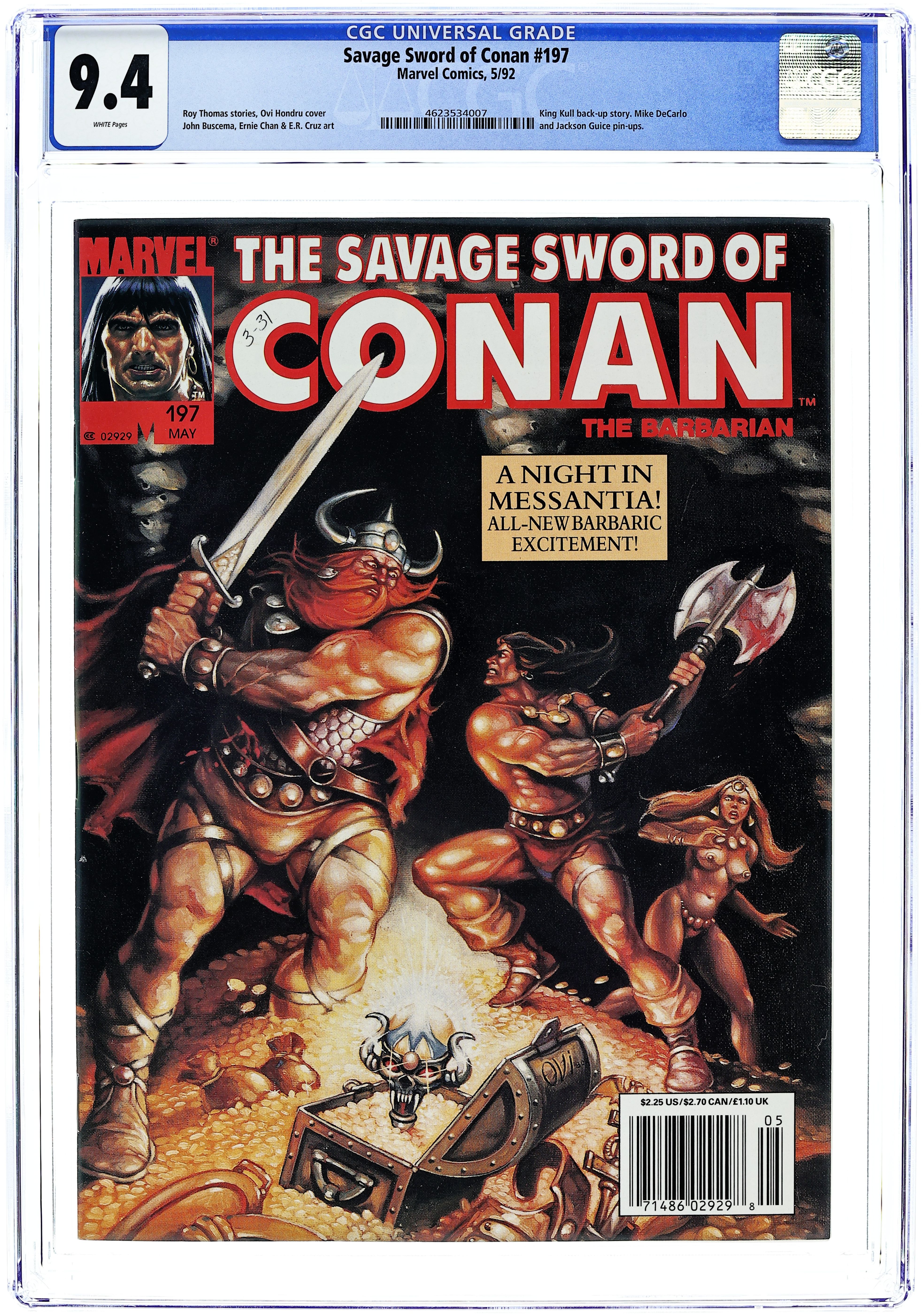 Conan stars in "A Night in Messantia." Script by Roy Thomas, pencils by John Buscema, inks by Ernie Chan. Young Kull stars in "Raiders of the Pictish Isles." Script by Thomas, art by E.R. Cruz. Pin-ups by Chan, Sandu, Archibald Petreccat, Mike DeCarlo, and Jackson (Butch) Guice. Ovi cover. Cover price $2.25.