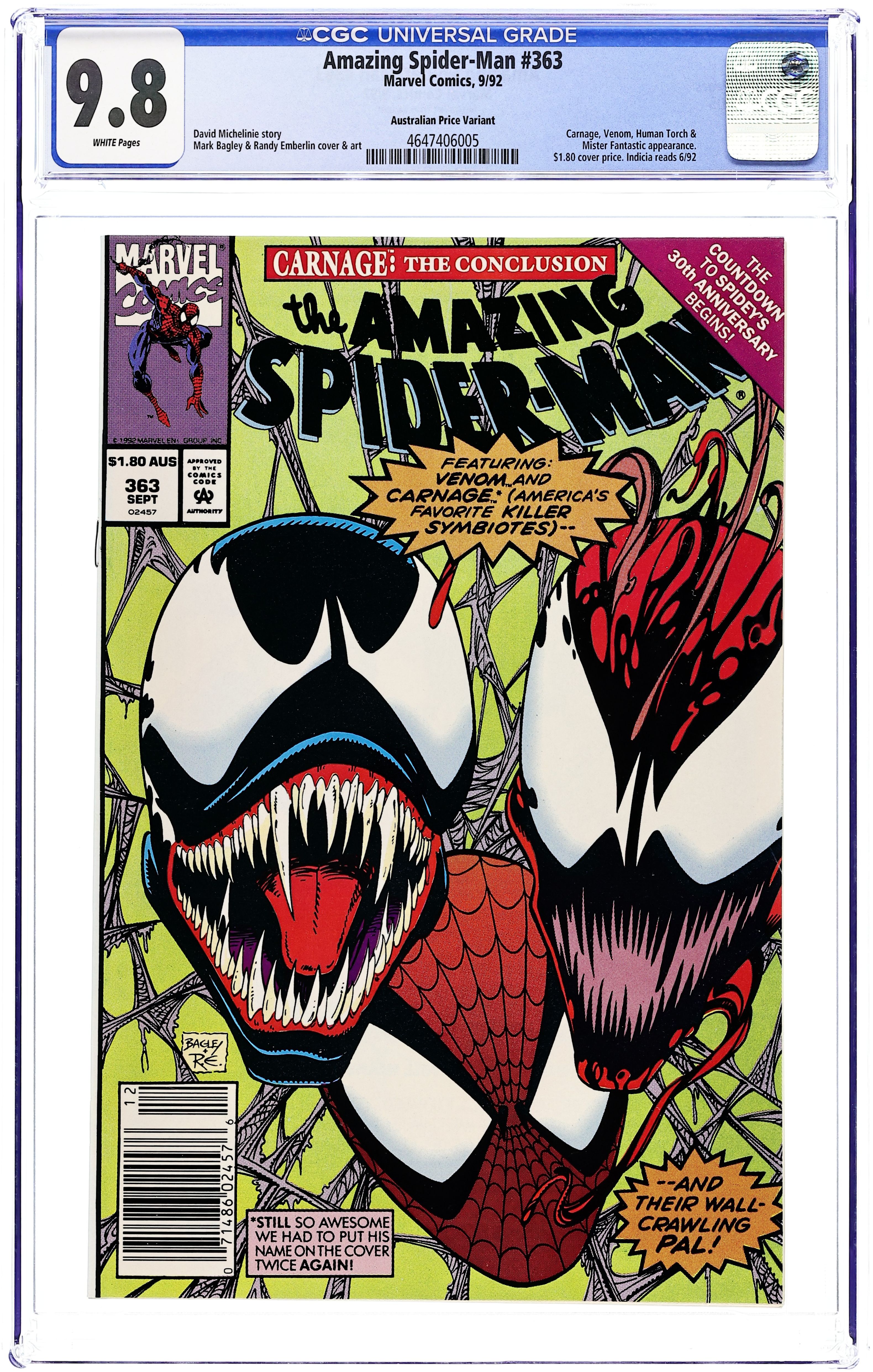 Starts Jan 3 Australian Price Variant. $1.80 cover price. "Savage Alliance!" Part 2 of 3. Guest-starring the Human Torch. Script by David Michelinie. Pencils by Mark Bagley. Inks by Randy Emberlin. Cover by Mark Bagley and Randy Emberlin. After getting a taste of Carnage's raw power last issue, the wall-crawler knows he needs serious help! To that end the amazing one does the unthinkable! He pays a visit to Venom! Wow, is that a good idea? However as a precaution the web-slinger brings Johnny Storm along for the ride to Venom's deserted island! And following an intense battle, Venom surprisingly agrees to help his good pal Spidey! So in a truly unlikely pairing, the Spectacular Spider-Man and the Lethal Protector join forces to take down Carnage! You have to see it to believe it! Cameo appearance by J. Jonah Jameson. (Note: The issue includes a full-page ad for the Toxic Crusaders (1992) series with art by Sam Kieth.) 32 pages.