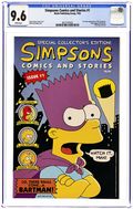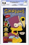 Simpsons Comics and Stories Butterfinger Mini Comic Edition (1993) is a giveaway (despite the $2.50 cover price) variant of the full-size comic, with all the stories and ads that appear in the regular edition. The cool thing about this small-sized No. 1 is that it was found only in packages of Butterfinger candy bars. That's why it's so small. It may have come out BEFORE the actual No. 1 issue hit the stands, which would make this mini comic edition the first appearance of the Simpsons. As with the full-sized edition, stories include "Lo, There Shall Come a Bartman" (co-plot by Cindy Vance, script, layouts, and inks by Steve Vance, inks by Bill Morrison and Mike Anderson), "Bring Me the Head of El Barto" (script and art by Morrison), and "Maggie's Excellent Adventure" (co-story and layouts by Steve Vance, co-story by Cindy Vance, finished art by Ray Supreme). Cover price $2.50.