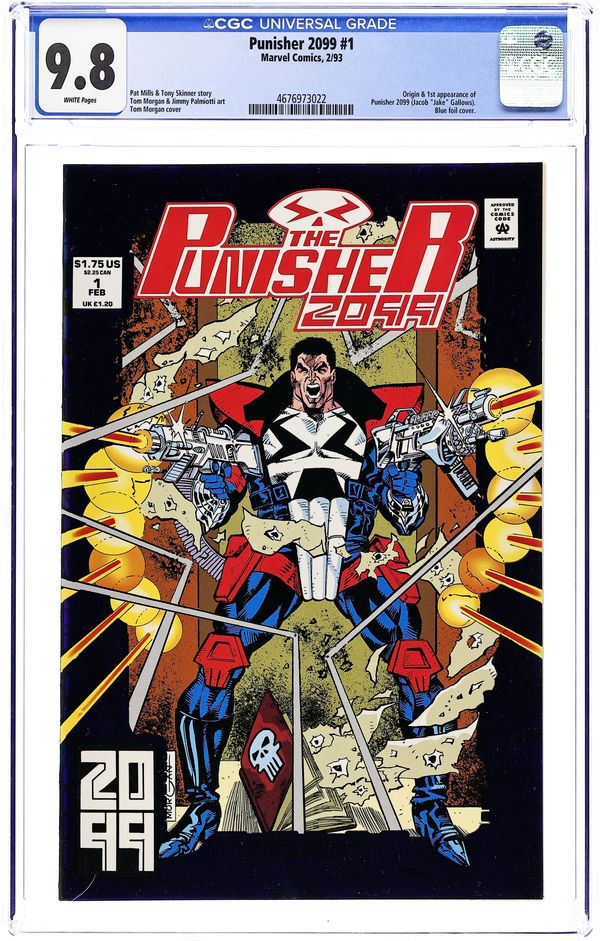 Newsstand Edition. Foil stamped cover. Cover by Tom Morgan and Jimmy Palmiotti. Deadly Genesis, script by Pat Mills and Tony Skinner, art by Tom Morgan and Jimmy Palmiotti; After his family is murdered by the serial killer Kron Stone, Jake Gallows is outraged when Kron is set free with little more then a slap on the wrist due to his social status; Jake is disillusioned by the legal system of his era and then uses the War Journal of Frank Castle as his inspiration, taking up the mantle of The Punisher. 36 pgs., full color. $1.75. See also Punisher War Journal #50. Cover price $1.75.