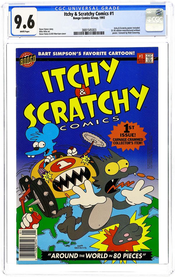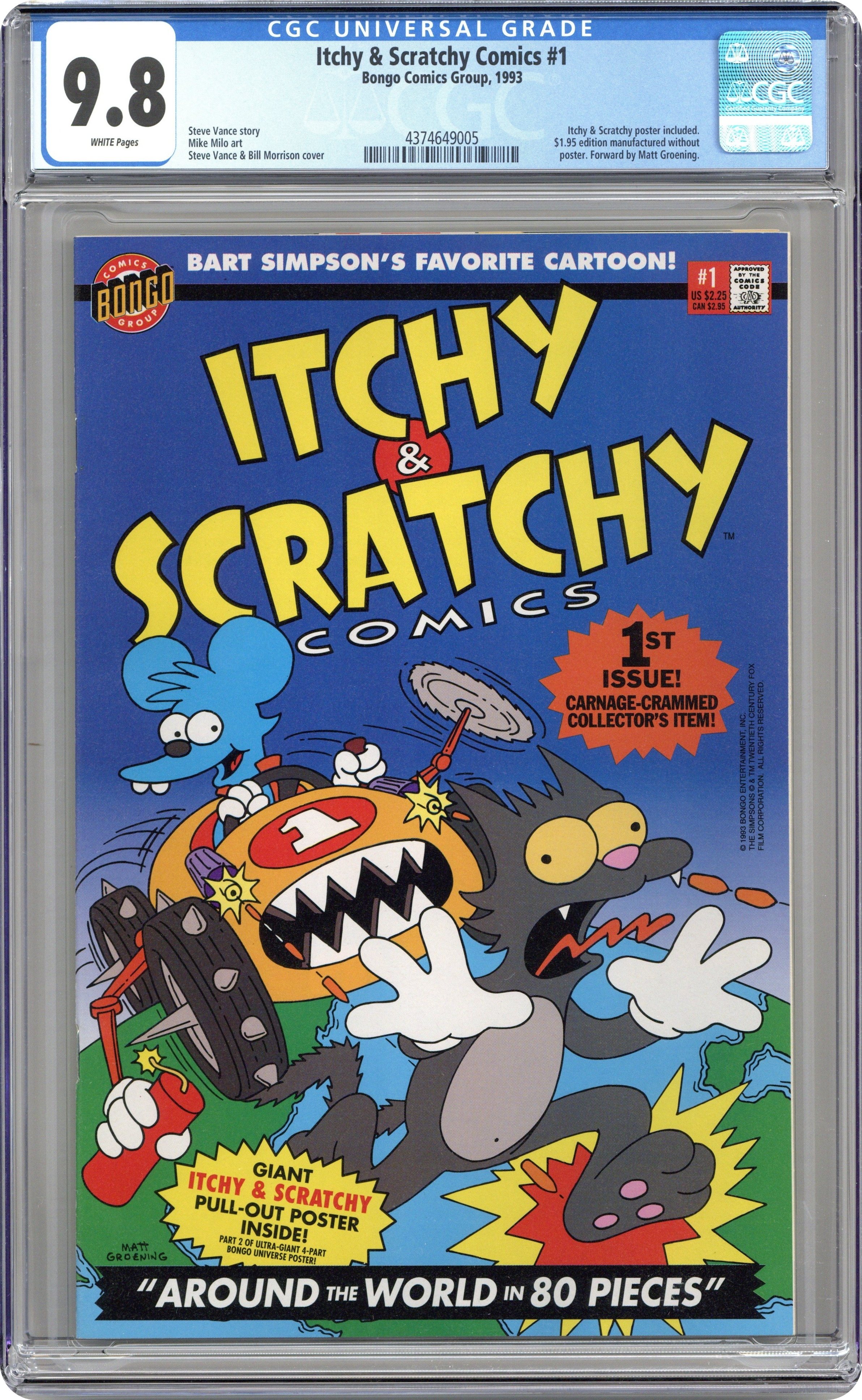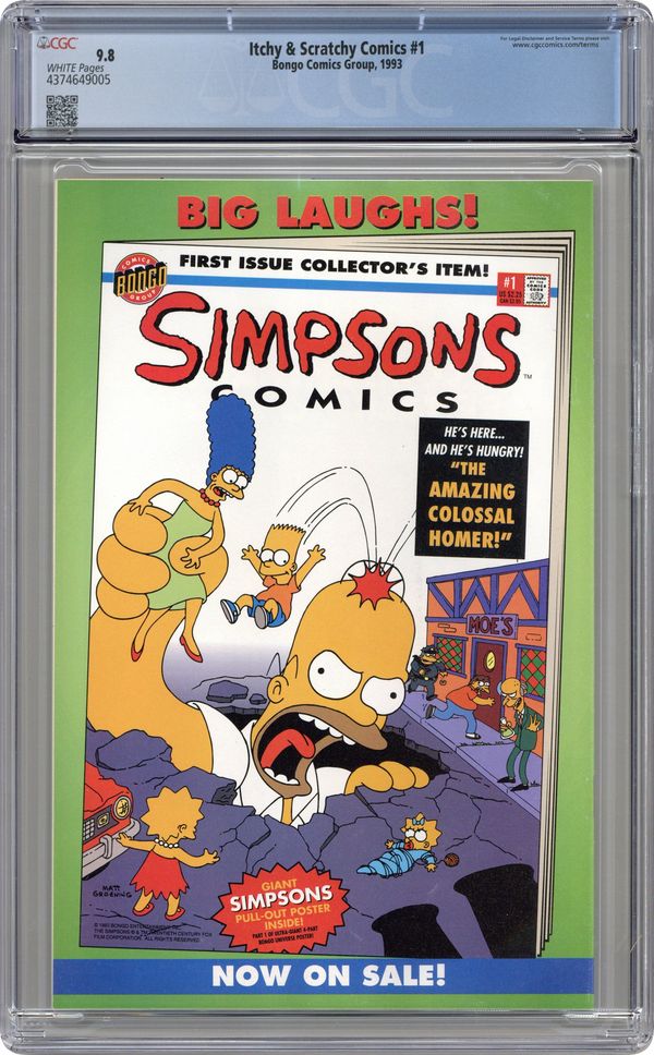 Regular Edition with "Giant Simpsons pull-out poster." Creepy Crawly Tales flip-book. Cover art by Bill Morrison. The Amazing Colossal Homer, script by Steve Vance (plot and script) and Cindy Vance (plot), pencils by Steve Vance (layouts) and Bill Morrison (finishes), inks by Bill Morrison and Tim Bavington; Mr. Burns tests his Rejuvenator Ray on Homer Simpson, resulting in Homer growing to colossal proportions. The Collector!, script by Steve Vance, pencils by Steve Vance (layouts) and Sondra Roy, inks by Bill Morrison; The Collector accidently locks himself in his comic vault when the butler goes away for the weekend, and must burn his precious comic collection to avoid freezing to death. 36 pgs. $2.25. Cover price $2.25.