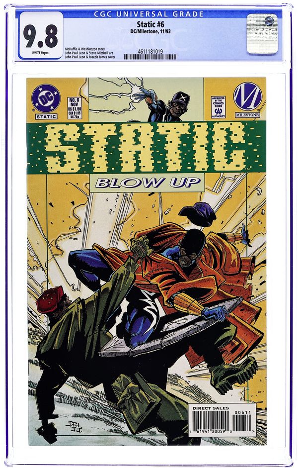 Part 2 of 3. Commando X's plot to pit Dakota's African-American and Jewish communities against one another threatens to cause full-scale race riots. Static goes undercover in order to learn Commando X's secret and prevent disaster. Written by Robert L. Washington III, with art by John Paul Leon and Steve Mitchell. Cover pencils by Leon. Cover price $1.50.