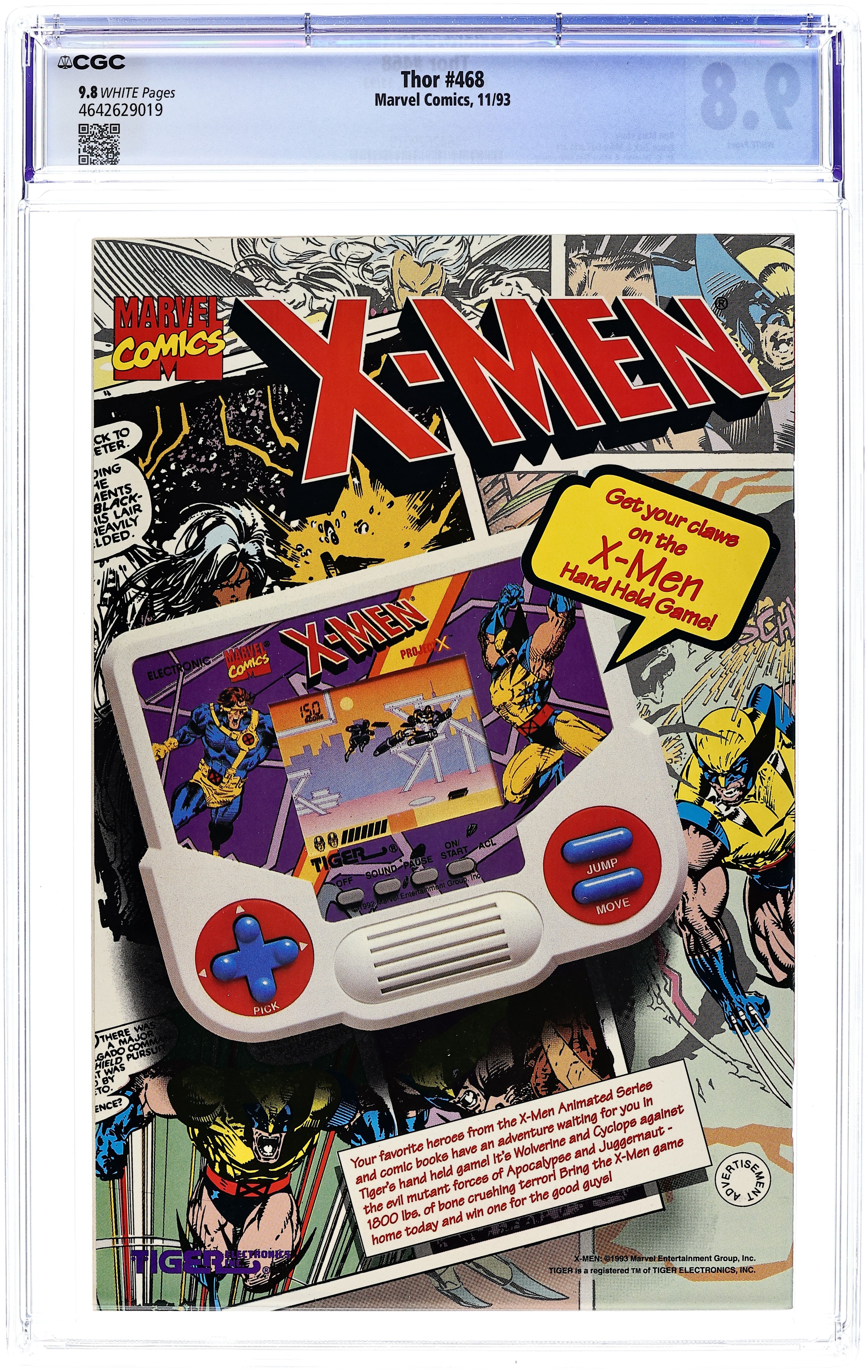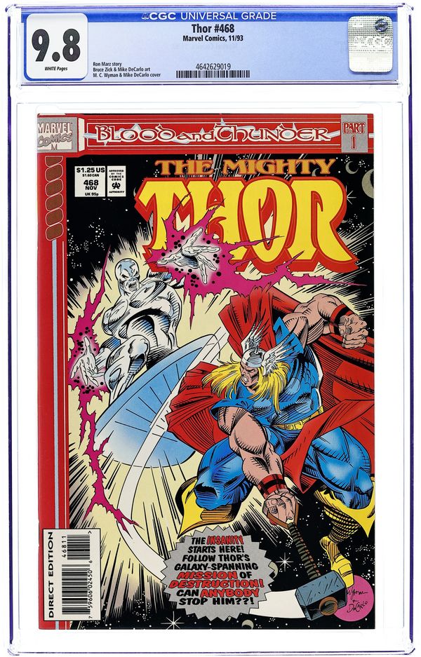 Direct Edition. Blood and Thunder. Part 6 of 13. Guest-starring Thor, Adam Warlock, and Doctor Strange. Story by Ron Marz. Art by Andy Smith and Tom Christopher. Cover by Ron Lim and Keith Aiken. Story continued from Thor 469. The God of Thunder has gone mad and none have the power to stop him. Adam Warlock and the Silver Surfer seek out the council of Doctor Strange, Master of the Mystic Arts. Story continues in Warlock Chronicles #7. 32 pages. Cover price $1.25.
