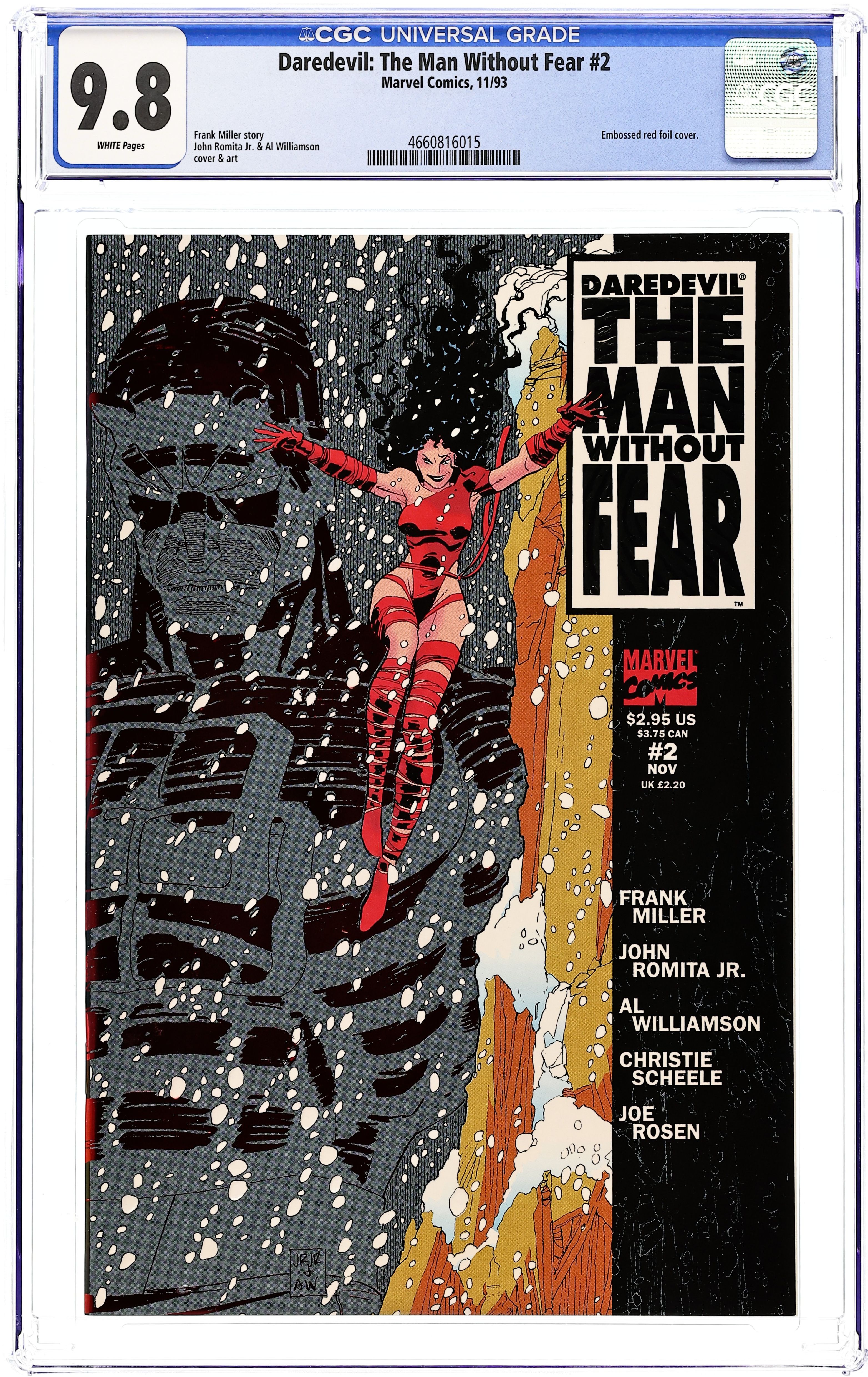 Matt gets revenge for what the Fixer and his thugs did to Battlin' Jack Murdock, then encounters the captivating, thrill-chasing Elektra while at Columbia University. Part 2 of 5. Script by Frank Miller, pencils by John Romita Jr., inks by Al Williamson. 32 pages of story. Romita Jr./Williamson cover. Red foil and embossing on cover. Cover price $2.95.