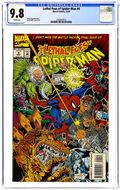 "Dreams of Innocence." Trial by Jury, Part 2 of 3. Maximum Carnage tie-in. Script by David Michelinie. Pencils by Mark Bagley. Inks by Randy Emberlin and Al Milgrom. Cover by Mark Bagley and Randy Emberlin. After being apprehended by the Jury last issue, the wall-crawler stands trial in their (kangaroo) court! Forget about habeas corpus and throw out the right to counsel... the sedated web-slinger must face his accusers alone! The Jury charges the amazing one with playing a part in the creation of Venom! And alas that is something Aunt May's nephew cannot completely deny. Once the Jury convicts Spider-Man, Orwell Taylor sentences him to death! The situation looks grim. Is it too late for an eleventh hour appeal? Cameo appearances by Mary Jane Watson, Aunt May, Richard Parker, and Mary Parker. Flashback cameos by the alien symbiote, Eddie Brock, Venom, Cletus Kasady, Carnage, Styx & Stone, Carrion, Shriek, and the Demogoblin to recap Venom's origin and the Maximum Carnage saga. (Note: This issue includes a 16-page advertising insert for the upcoming storylines in the Punisher and New Warriors titles; and the Ghost Rider Hot Pursuit Kay-Bee's Collector Edition #1 giveaway.) 52 pages. Cover price $1.25.