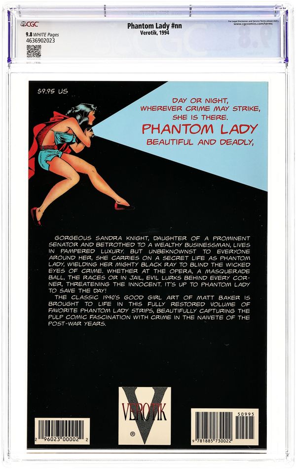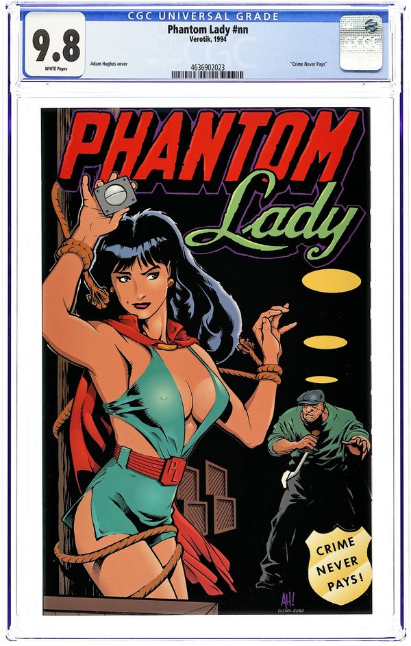 Cover by Adam Hughes. Collects stories from Phantom Lady (1947-1949 1st Series) #14-17 and All-Top Comics (1945-1949) #9 and 12. Art by Matt Baker and Adam Hughes. This collection of Phantom Lady stories would cost you nearly $5,000 on the Golden Age back-issue market. Verotik is offering this full-color square bound volume, including three new pieces of Adam Hughes art. Softcover, 64 pages, full color. Cover price $9.95.