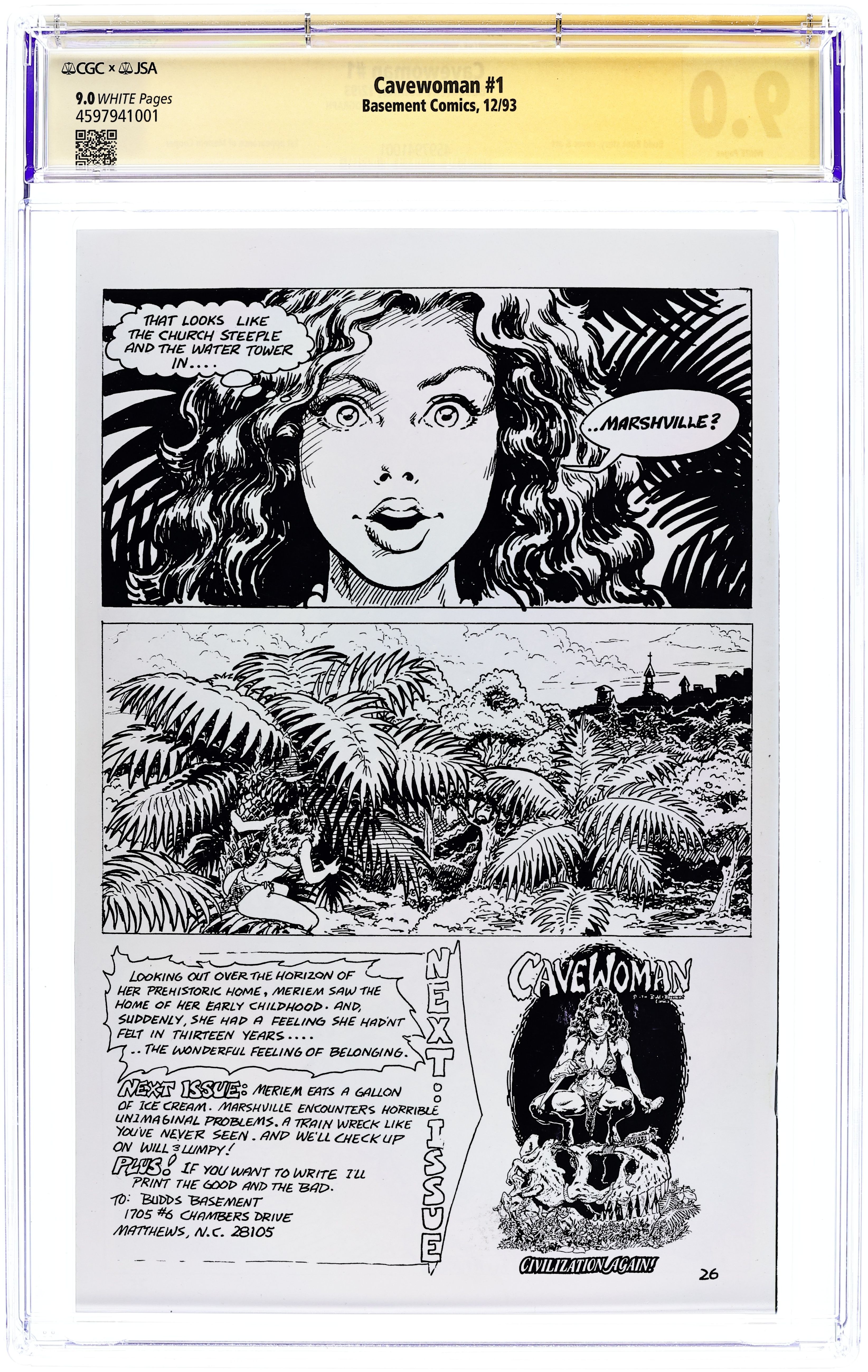 "Civilization Again!" The town of Marshville, through a huge time traveling accident, has catapulted back 70 million years to the age of the dinousaurs. The townspeople are suddenly finding seven ton, meat eating animals in their backyards. Young Will O'Brien and Frank "Lumpy" Reicher are saved by Meriem (Cavewoman). Story and art by creator Budd Root. Cover price $2.95.
