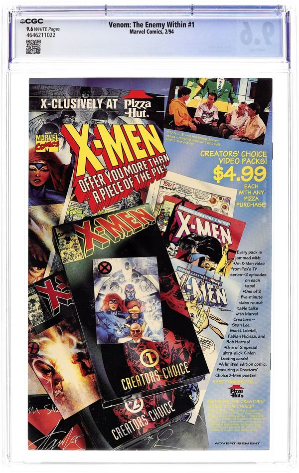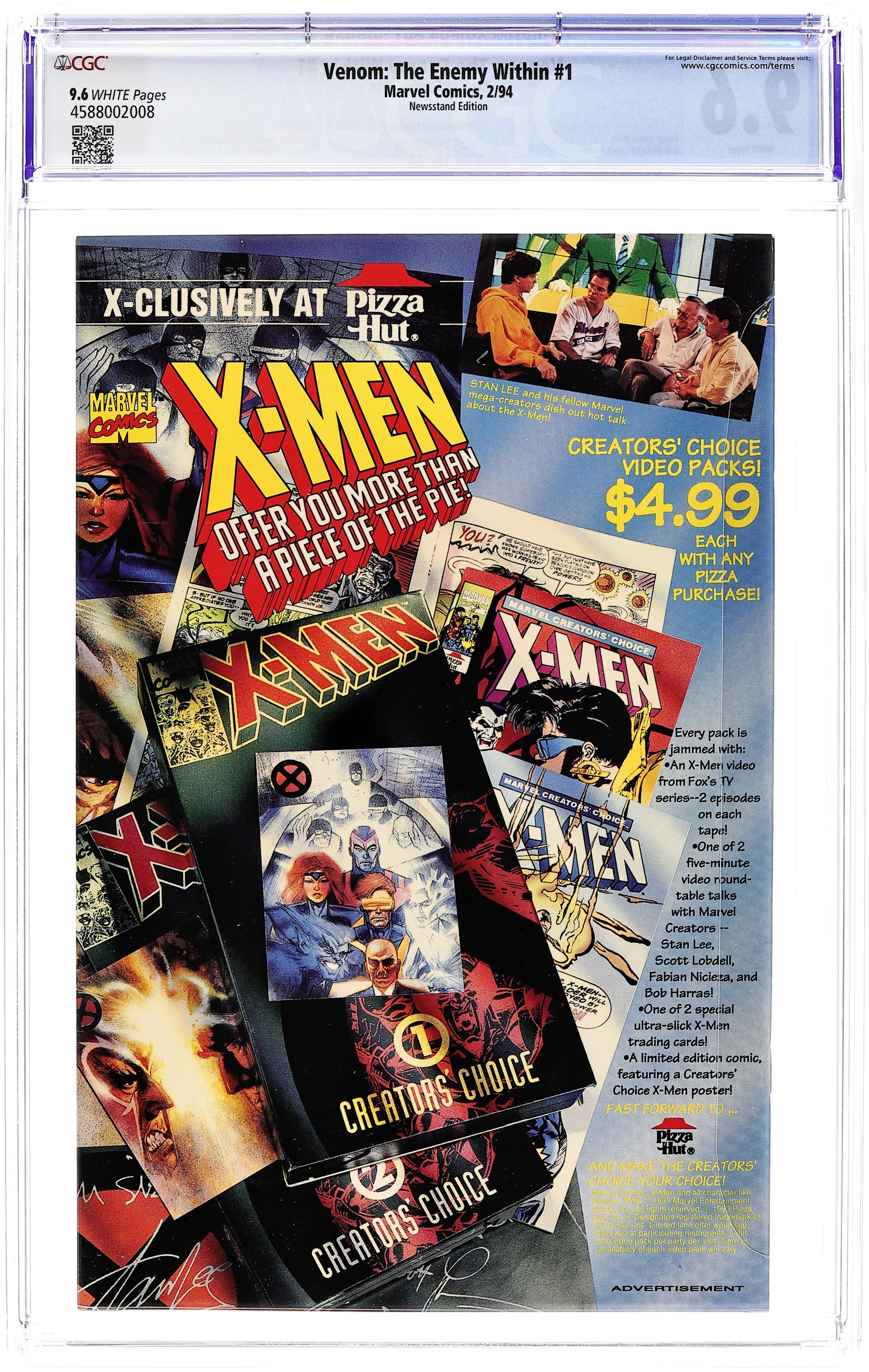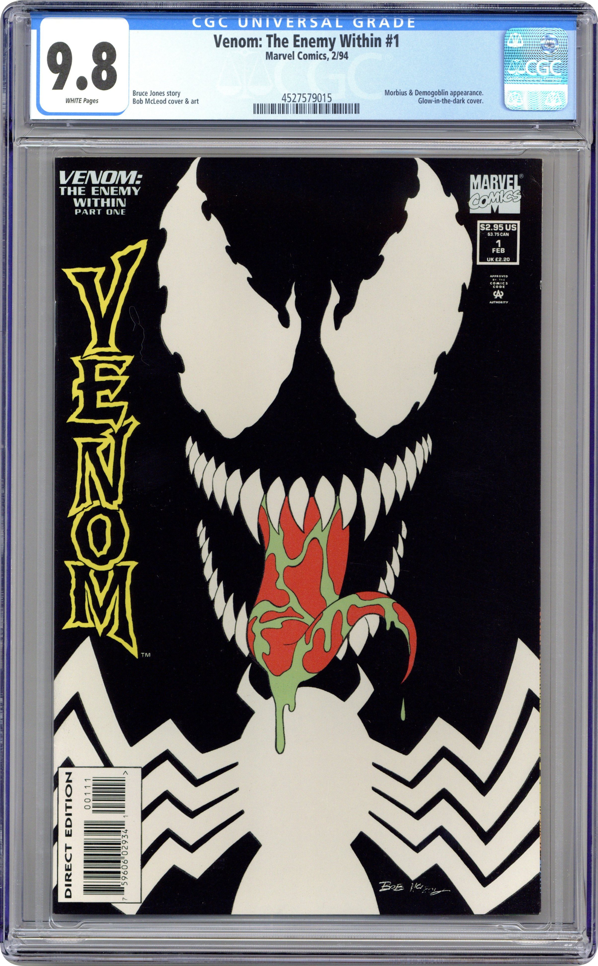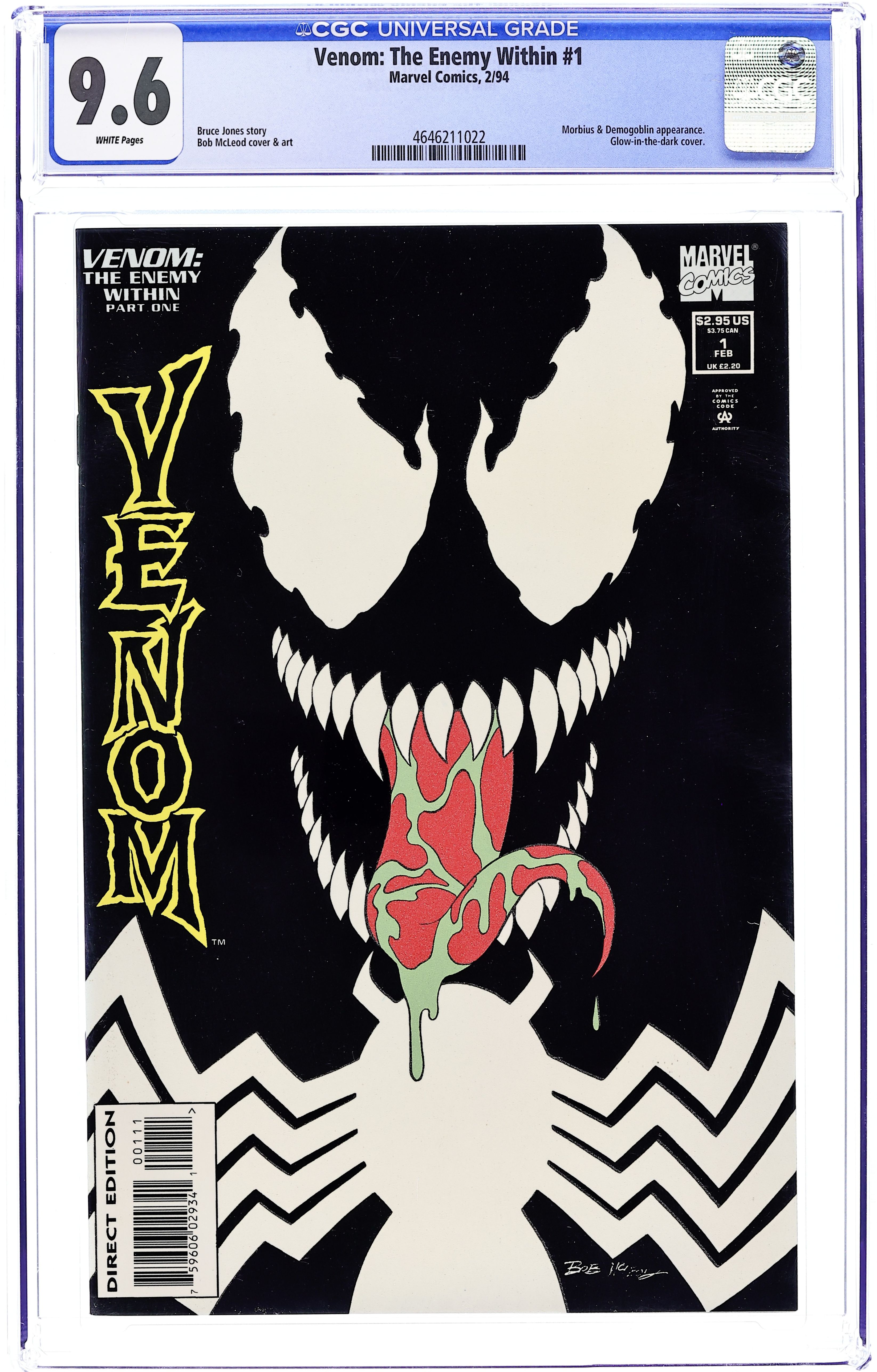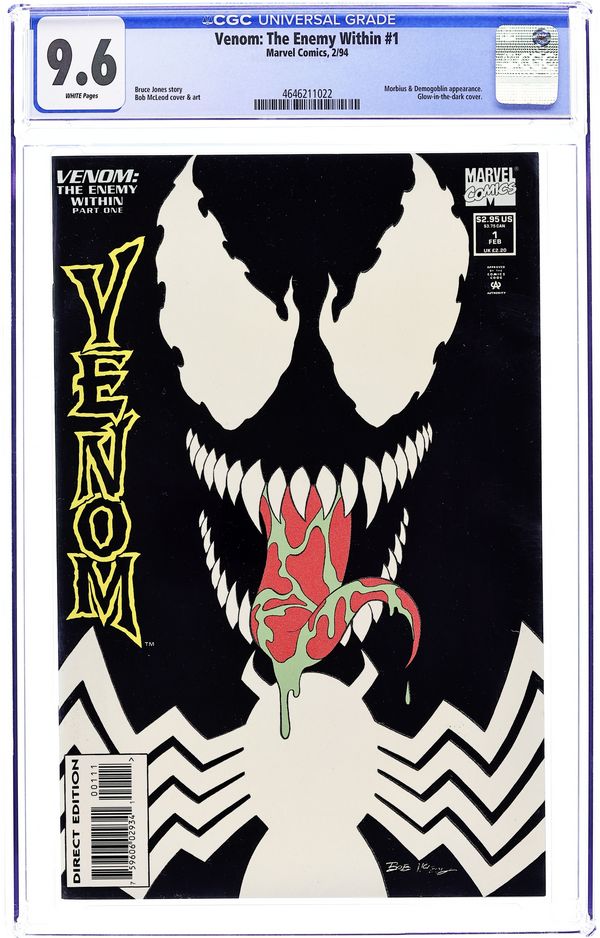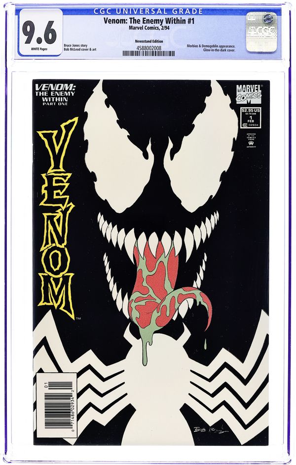 Newsstand Edition. This Venom limited series premiere features a cardstock cover with glow-in-the-dark detail and is printed on glossy stock. Everybody's favorite symbiote mixes it up with Morbius when a horde of demons tries to take over San Francisco. Will the Lethal Protector end up dead? Written by Bruce Jones. Art and cover by Bob McLeod. Cover price $2.95.