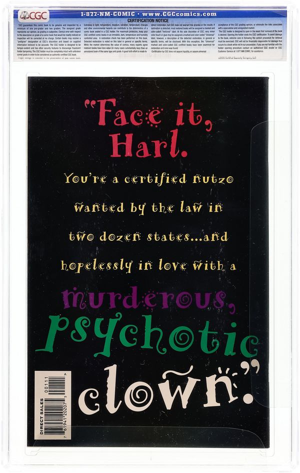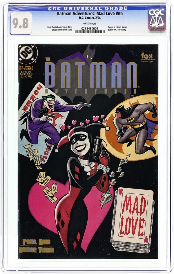Story by Paul Dini, art by Bruce Timm. Featuring the origin of the Joker's girlfriend, Harley Quinn. This is the 1st Printing, which has a black cover and a playing card in the lower right corner with "Mad Love" in red letters. Cover price $3.95.