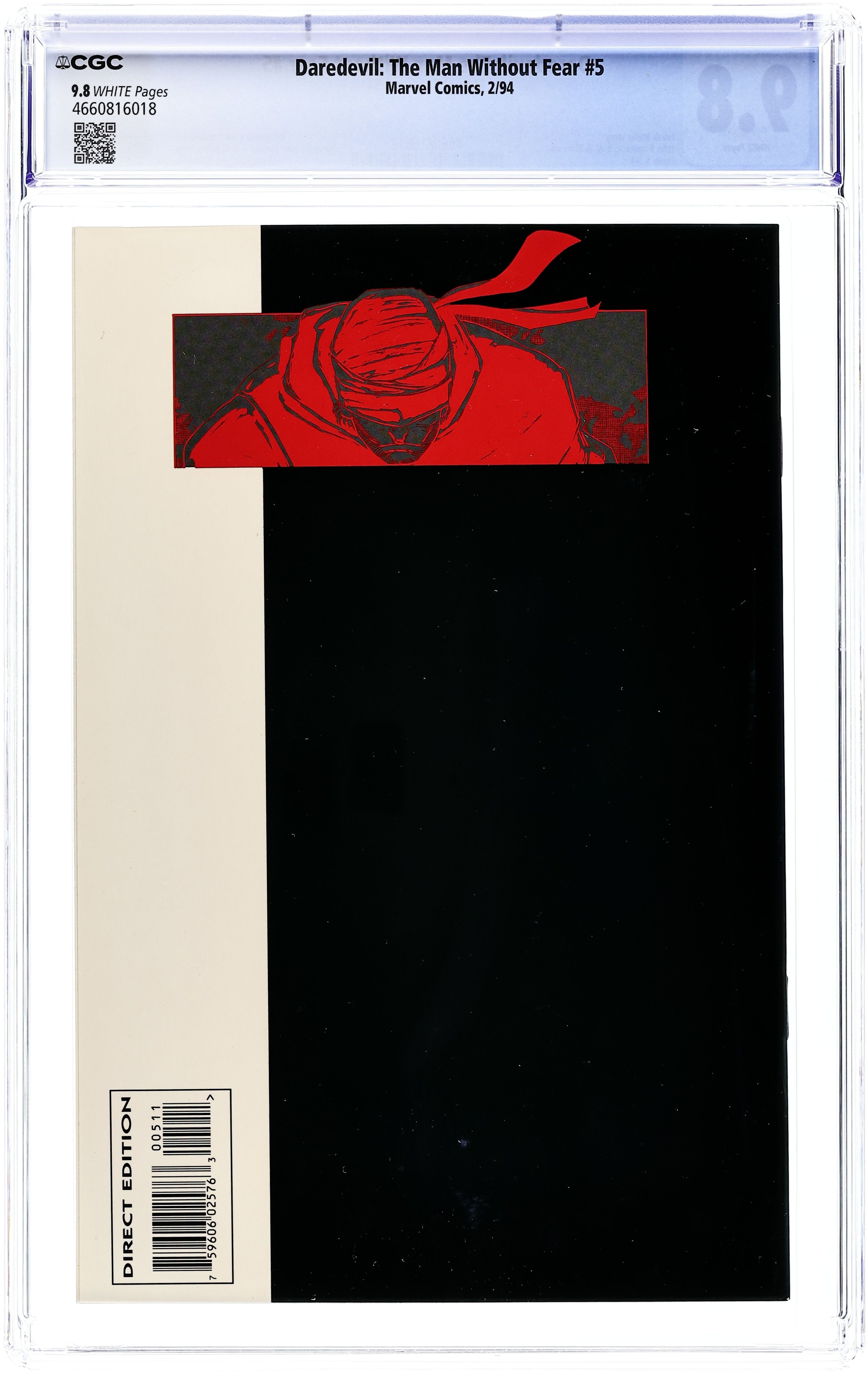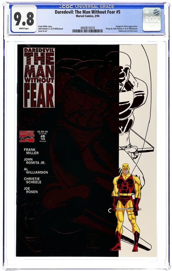 The Kingpin's child slavery ring is exposed, and Hell's Kitchen gets a defender by the name of...Daredevil. Part 5 of 5. Script by Frank Miller, pencils by John Romita Jr., inks by Al Williamson. Stick cameo. Humorous phone conversation recollections written by Romita Jr. Deleted pages by Romita Jr. and Williamson from #4. Unseen cover to #4 by Romita Jr. and Williamson. Book is dedicated to the memory of Dom 'Mickey' Romita. 25 pages of story. Romita Jr./Williamson cover. Red foil and embossing on cover. Cover price $2.95.