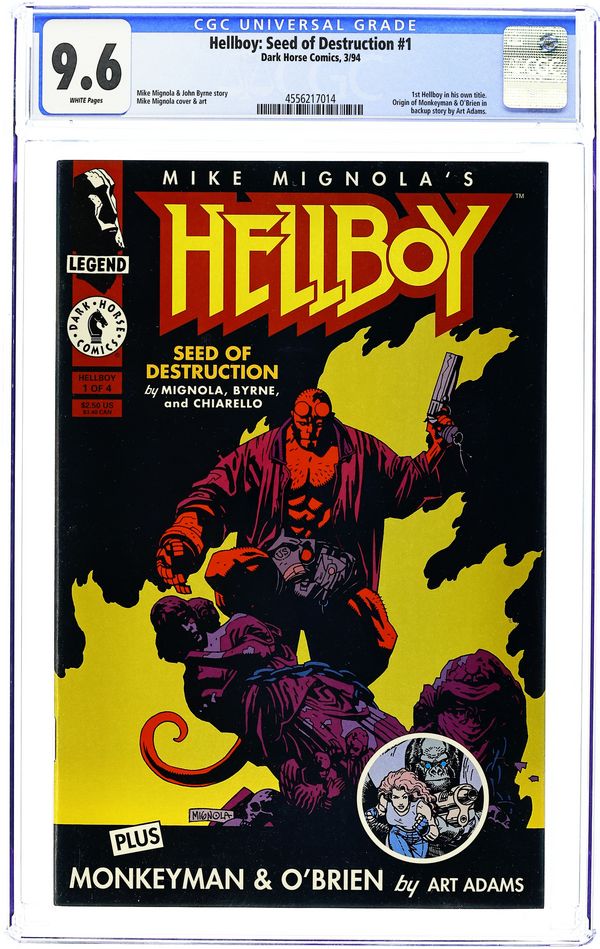 Written by Mike Mignola and John Byrne. Art by Mike Mignola. Hellboy bursts onto the film noir monster detective scene. From his apocalyptic origin in WWII England to the modern-day case of the sole survivor of a doomed Arctic expedition, Hellboy must battle vampire frog creatures and worse in his debut miniseries. Created by Mike Mignola, with script by John Byrne, and colors by Mark Chiarello. Hellboy -- World's Greatest Paranormal Investigator. Also featuring chapter one in the astounding origin of Monkeyman and O'Brien, the most dynamic duo since a talking scientific genius (who also happens to be an ape) and a beautiful, super-strong blonde (who also happens to be a scientist) teamed up to battle extra-dimensional menaces while looking for a way to return Monkeyman to his home dimension! Story and art by Arthur Adams. 32 pages, FC. Cover price $2.50.