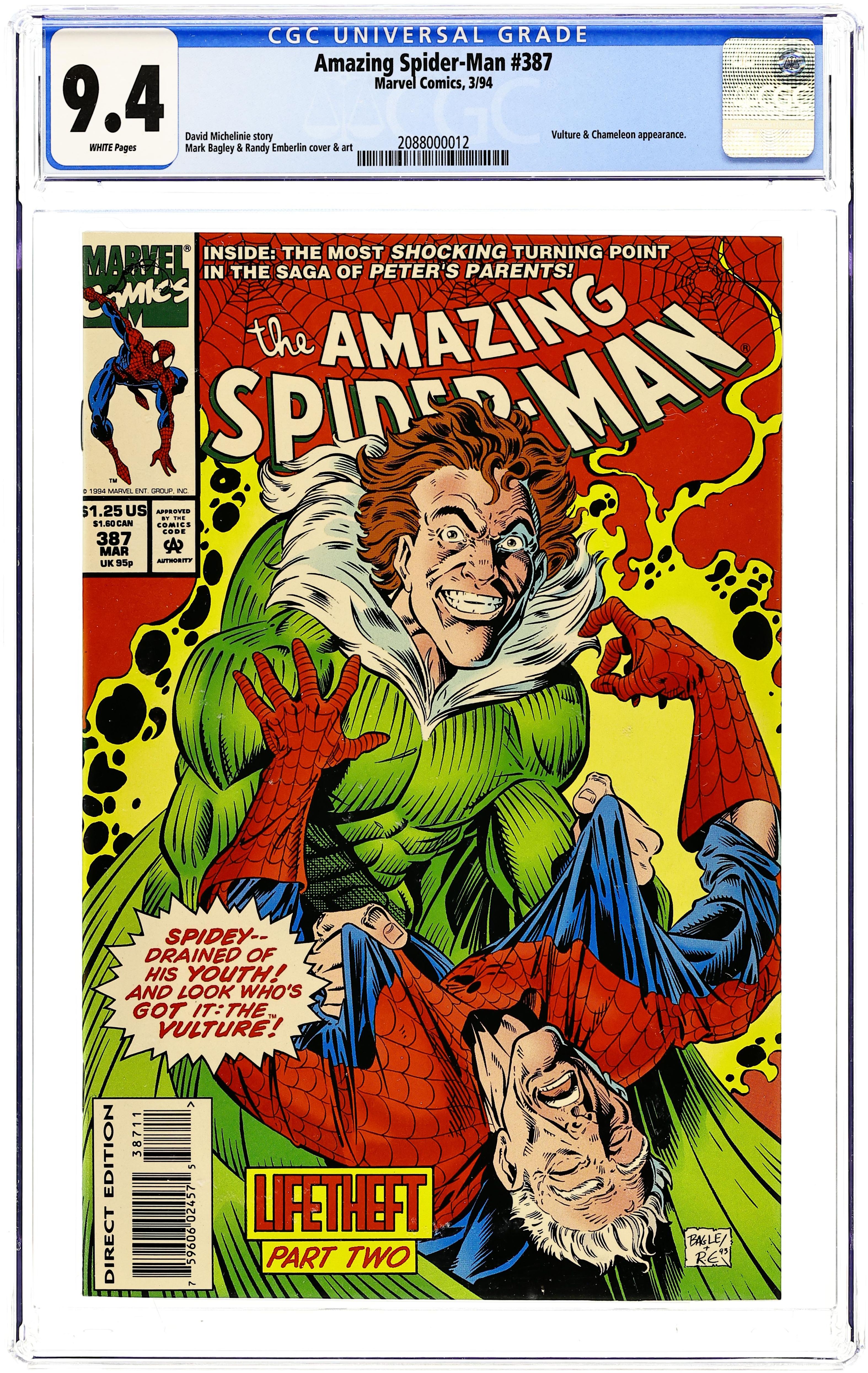"The Thief of Years" Lifetheft Part 2 of 3. Script by David Michelinie. Pencils by Mark Bagley. Inks by Randy Emberlin. Cover by Mark Bagley and Randy Emberlin. In a stunning development, the Vulture drains Spider-Man's life energy via the Juvenator! And now the wall-crawler is an old man, while the Vulture is young again! Oh no, how will Peter explain his elderly condition to Aunt May and Mary Jane? Fortunately, the "experimental" Juvenator is just experimental and the process reverses itself in a few hours! Whew, thank goodness! However, the web-slinger is still shaken by his temporary transformation and decides to reveal his secret identity to his parents. A decision he will regret next issue! Cameo appearances by the Chameleon and Ben Urich. Last $1.25 cover price. (Note: This issue includes a foldout back cover featuring upcoming Marvel releases.) 38 pages. Cover price $1.25.
