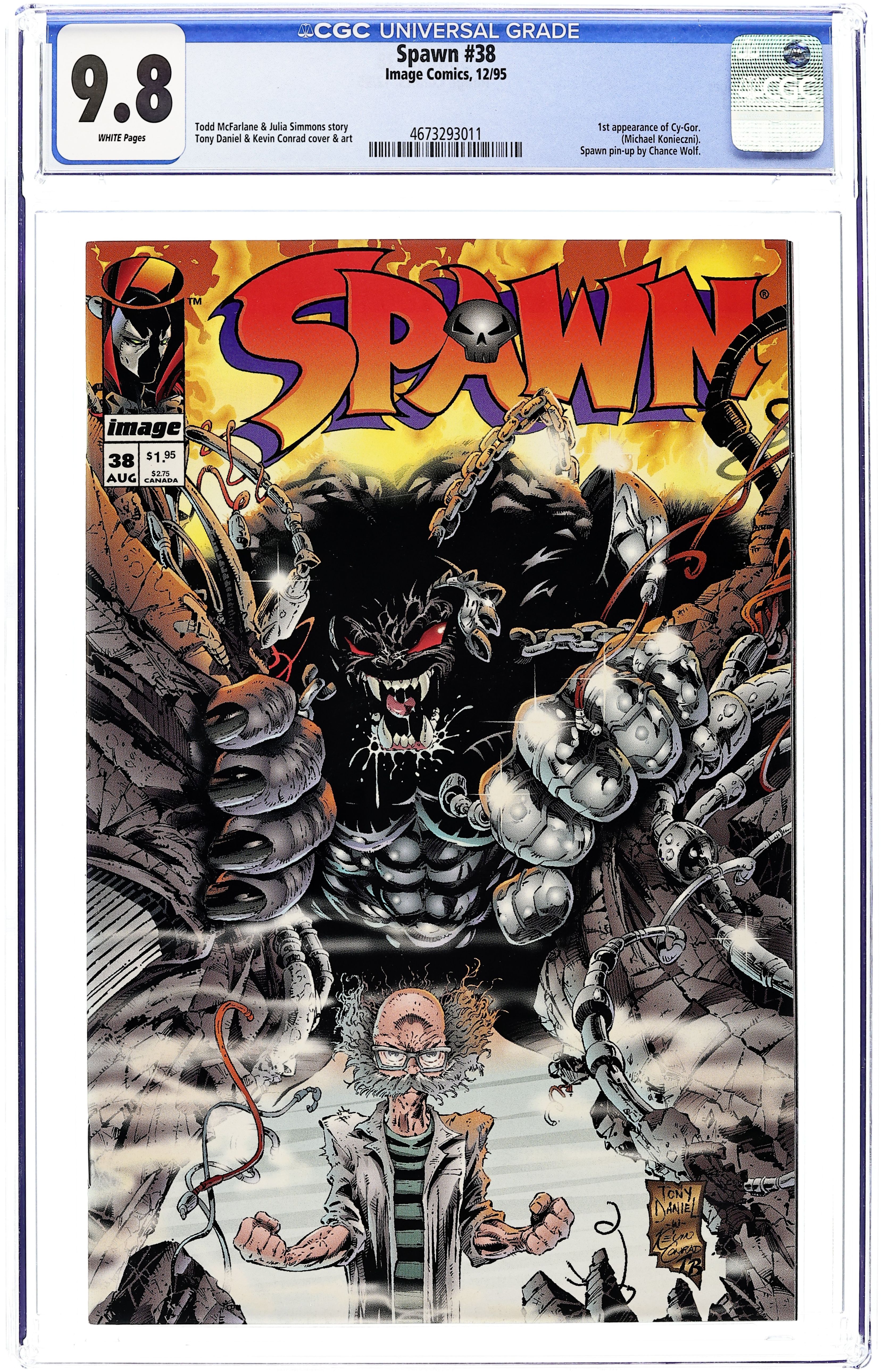 "Mind Games!" Written by Todd McFarlane and Julia Simmons. Art and cover by Tony Daniel and Kevin Conrad. For the first time in his existence, Spawn feels he has no purpose. He is spinning aimlessly, not knowing where to stop. The once clear target has disappeared. The mysterious hobo Cogliostro, made Spawn see that Jason Wynn was just a small pawn in a very large game. Until the true enemy is revealed, unknown random victims will fill the emptiness. 32 pages, FC. NOTE: This issue is dedicated to Marv Wolfman. 1st appearance of Cy-Gor Cover price $1.95.