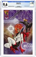 Special "Hey Kids, Comics! Edition" Wizard 1/2. Certificate of Authenticity. Featuring Dawn and Darrian as superheroes! Script, layouts & color guides by Joseph Michael Linsner. Pencils, inks & letters by Tom Artis. Plus: Dawn and Darrian concept sketches; a look at page 1, from layout to finished pencils; a look at the pencils for the covers.