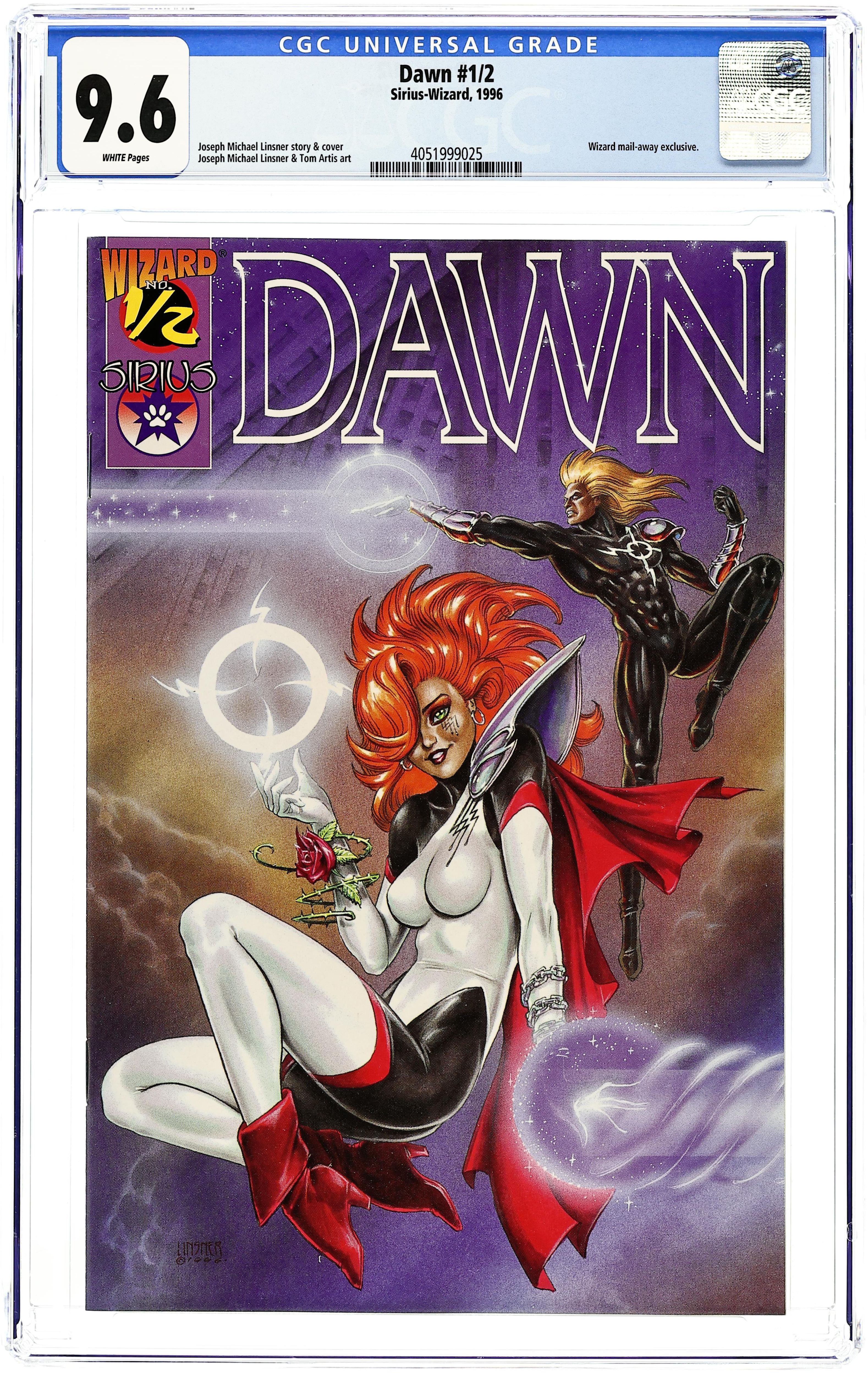 Wizard 1/2 Edition. Certificate of Authenticity. Featuring Dawn and Darrian as superheroes! Script, layouts & color guides by Joseph Michael Linsner. Pencils, inks & letters by Tom Artis. Plus: Dawn and Darrian concept sketches; a look at page 1, from layout to finished pencils; a look at the pencils for the covers.