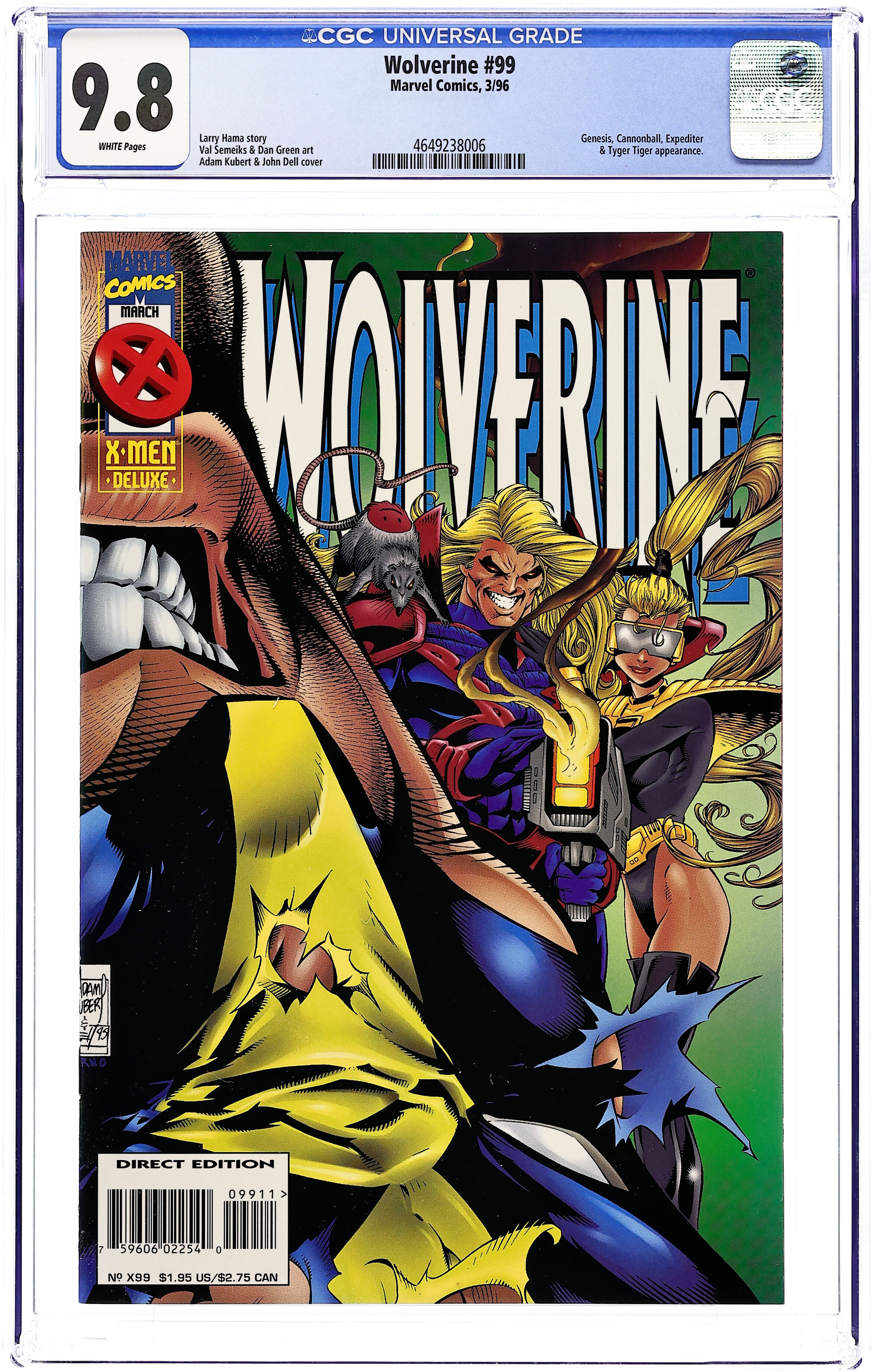 Deluxe Direct Edition. Cover pencils by Adam Kubert, inks by Richard Bennett. Of Mythic Metal Forged, script by Larry Hama, pencils by Val Semeiks, inks by Dan Green, Dan Panosian, and Chad Hunt; Wolvie arrives in Akkaba and sneaks into the citadel of Genesis only to be captured by the Dark Riders; Cannonball is hot on Logan's trail and makes it to Akkaba himself; Genesis prepares to bond Cyber's adamantium to Wolverine. 36 pgs. $1.95. Cover price $1.95.