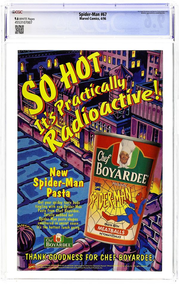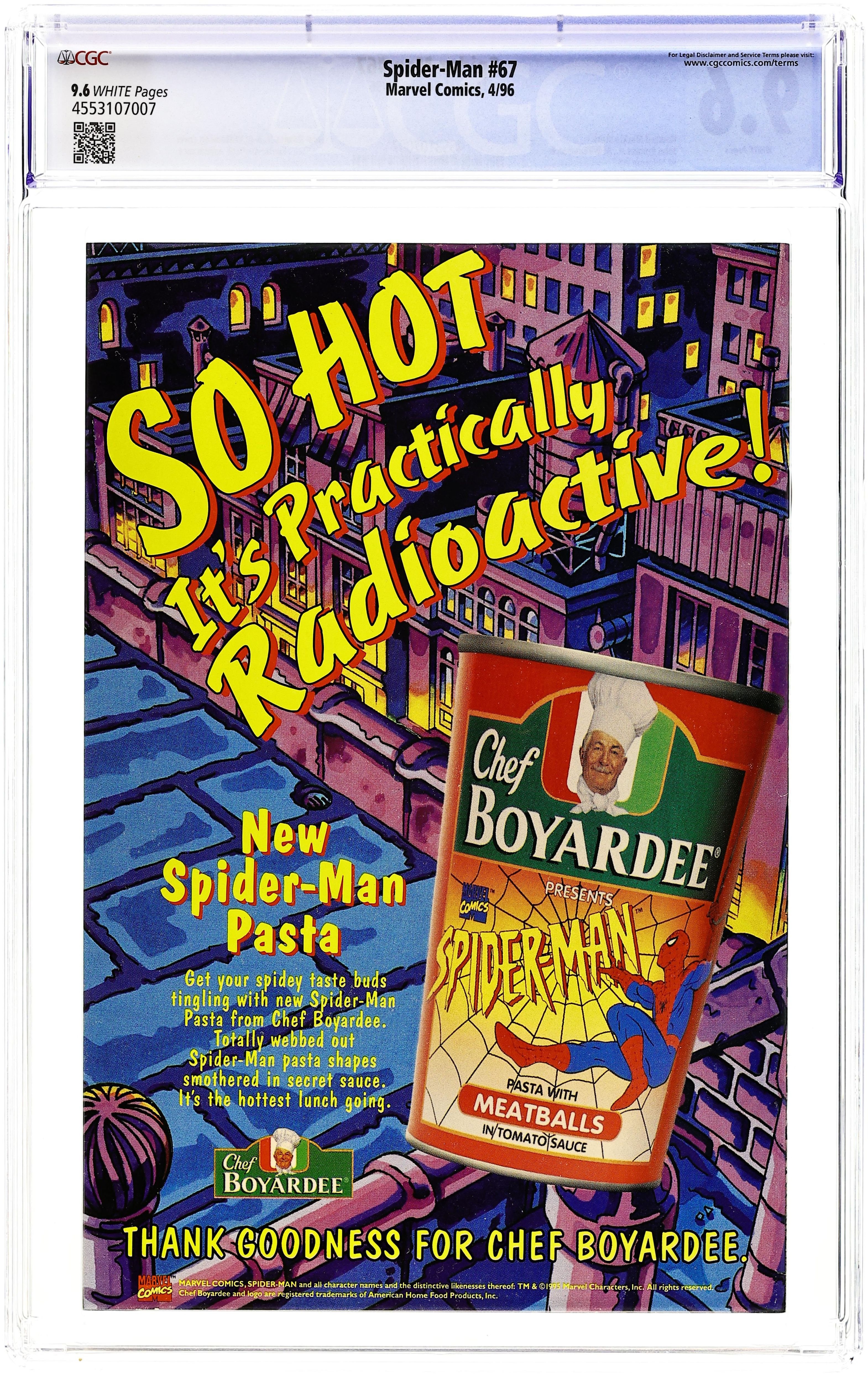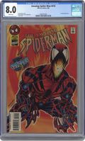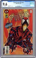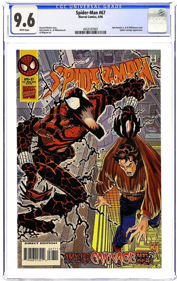 Direct Edition. Cover pencils by Mark Bagley, inks by Larry Mahlstedt. It's Carnage versus Spidey in Web of Carnage Part 2 of 4, "And Now - Spider-Carnage," script by Tom DeFalco, pencils by Mark Bagley, inks by Larry Malhstedt and Randy Emberlin; Spidey and Peter learn the Spider-skeleton is an actual Spider-Man clone and that Ben's girlfriend Jessica Carradine is the Burglar's daughter (SenSM #3, '96); Meanwhile, Carnage terrorizes the city even though Cletus Kasady is safe in his cell; Seeking answers, Spidey follows Ravencroft guard Dickerson to an underground super-villain-worshipping club where Dickerson sells Carnage memorabilia filched from Ravencroft; Carnage attacks the club, and battles Spidey, escaping after bringing down the roof; At the Daily Bugle, Jessica gets a job to photograph Spidey as a public menace; Spidey tails Ravencroft security chief John Jameson, discovering him possessed by the Carnage symbiote. The story continues from Sensational Spider-Man 3 and continues in Spider-Man 67. 36 pgs., full color. $1.50. Cover price $1.50.