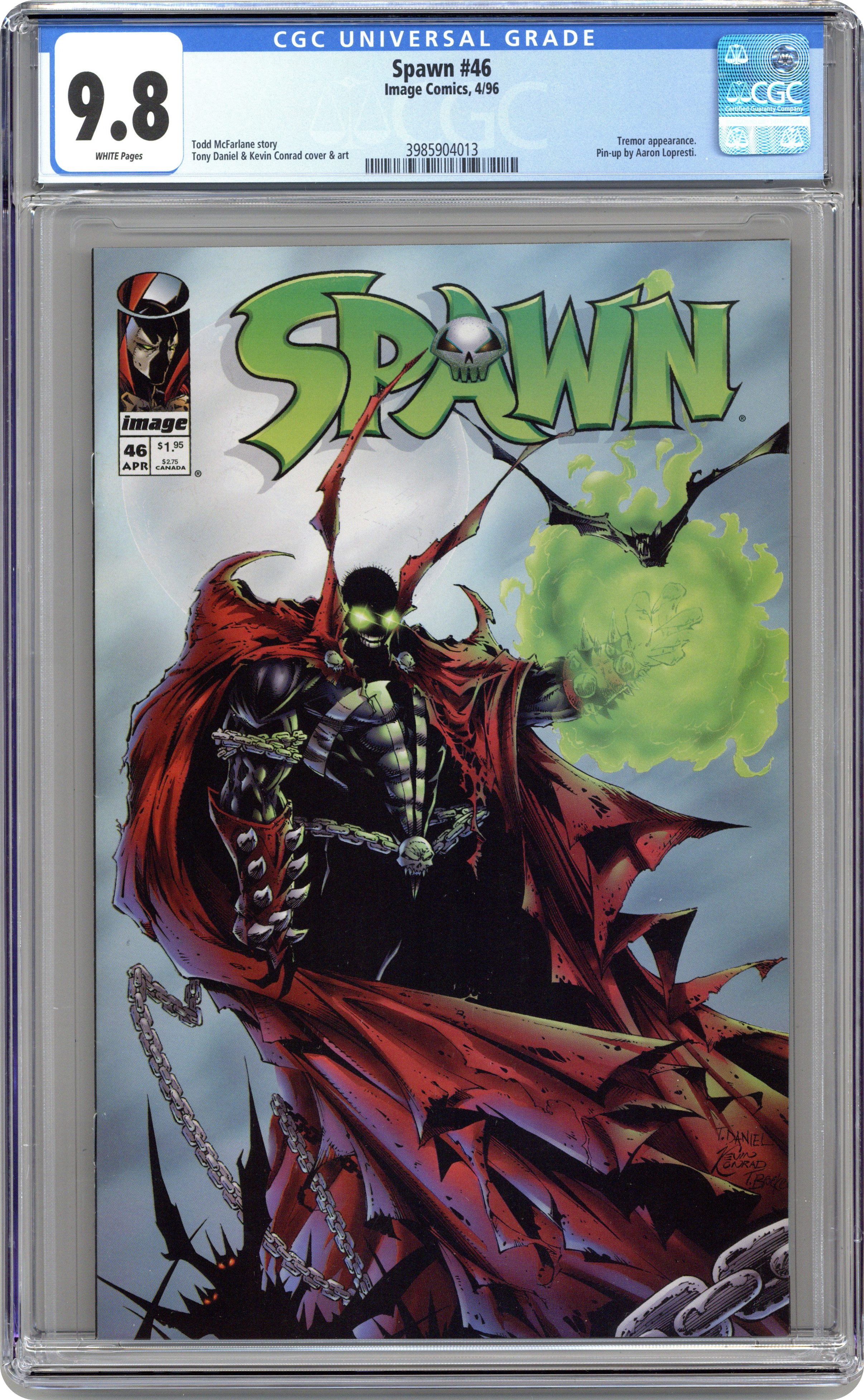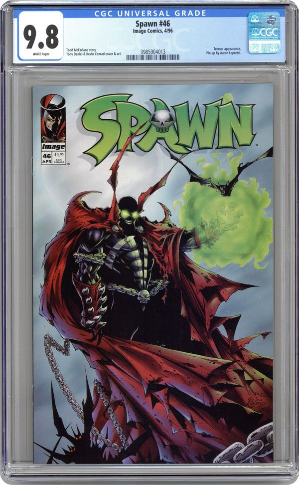 Direct Edition. "Revenge!" Written by Todd McFarlane. Art and cover by Tony Daniel and Kevin Conrad. Mafia leader, Tony Twist, orders an employees execution after suspecting him of stealing, and then receives a call from Sicily demanding the return of Overtkill. Tremor returns to murder two of Twists men before visiting him personally. During their encounter Twist tells Tremor that his brother, David, is still alive. In the alleys of New York, Spawn protects those essential to his existence, the worms, as he rebuilds his power. Spawn learns from Cogliostro that the angels are made of plasma similar to his own, and that Tiffany still lives, as the only way to vanquish an angel is by absorbing her light. Cogliostro reminds Spawn to fight for what is right by opening his mind and learning. Tremor seeks out Spawn for help. Meanwhile, Wanda's work on the new hospital wing progresses and Terry's illness is starting to worsen. 32 pages, FC. NOTE: This issue is dedicated to Frank Frazetta. Cover price $1.95.
