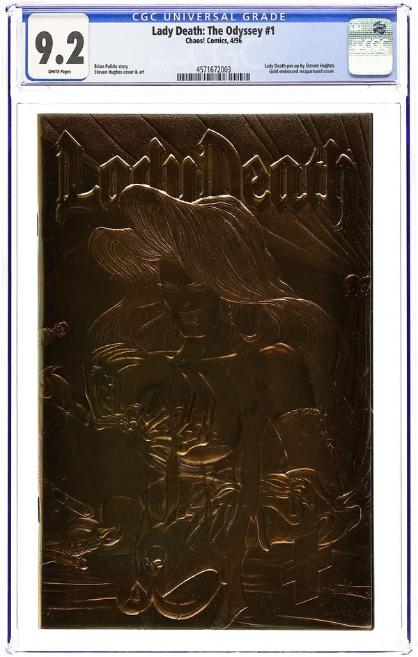 Chromium Gold Foil Embossed cover. Lady Death is trapped in the void between worlds by Pagan, the insidious court jester of Hell. "Crossroads" written by Brian Pulido, art by Steven Hughes, colors by Jason Jenson. Cover price $3.50.
