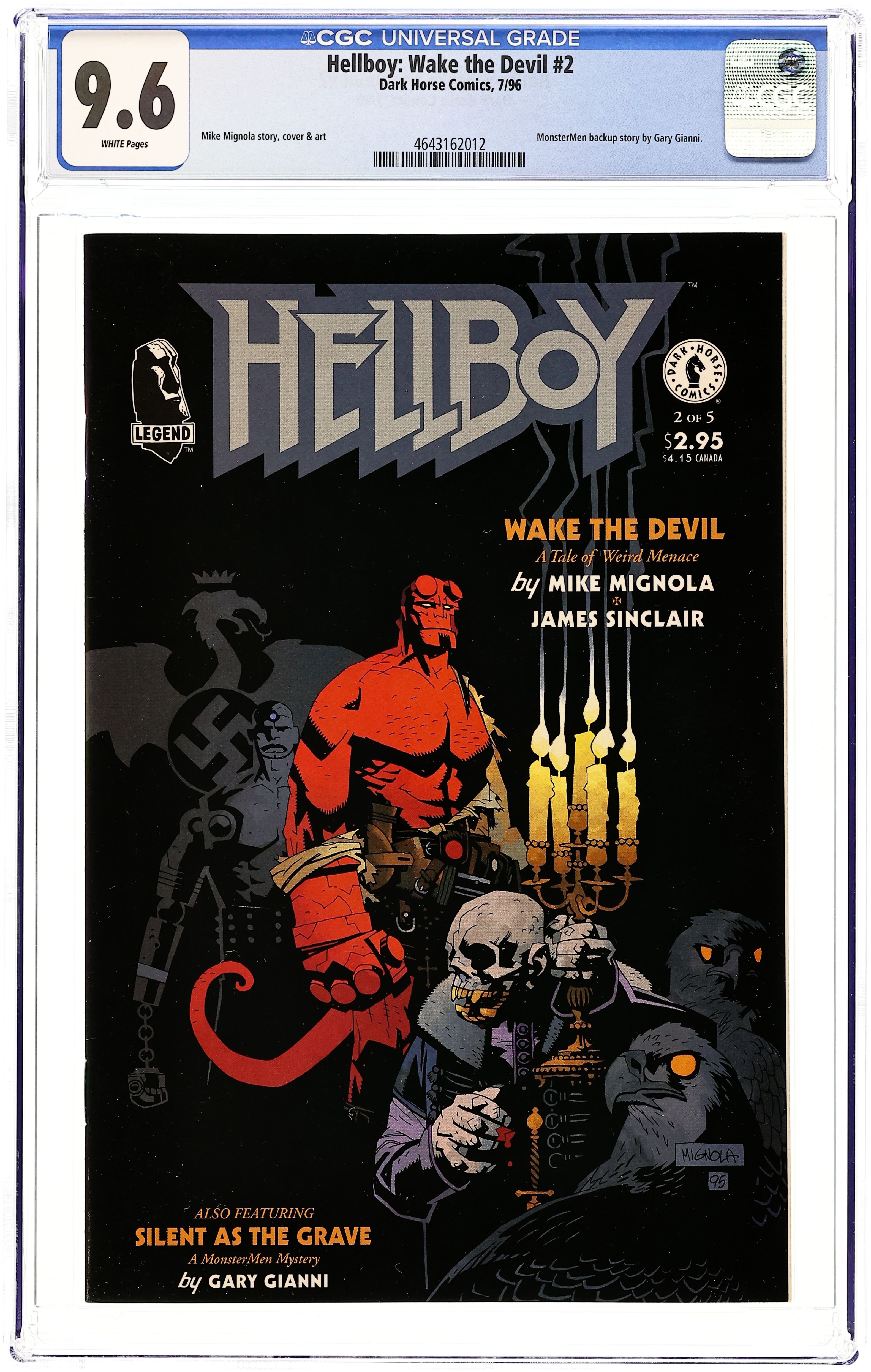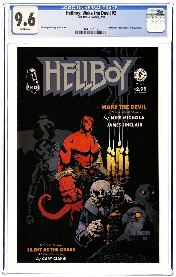 Story and art by Mike Mignola. In his quest to find the vampire Vladimir Giurescu, Hellboy must battle the flying metal fist of a bald Nazi supermonster! Danger lurks in every corner of Castle Giurescu, and Hellboy's prepared to meet it head-on! In the back-up, "Silent as the Grave," we meet the second half of the new mystery team, as the MonsterMen confront a monstrous Jib-Bic, in beautifully weird images that only new Legend member Gary Gianni (The Shadow: Hell's Heat Wave) could cook up. 32 pages, FC. Cover price $2.95.