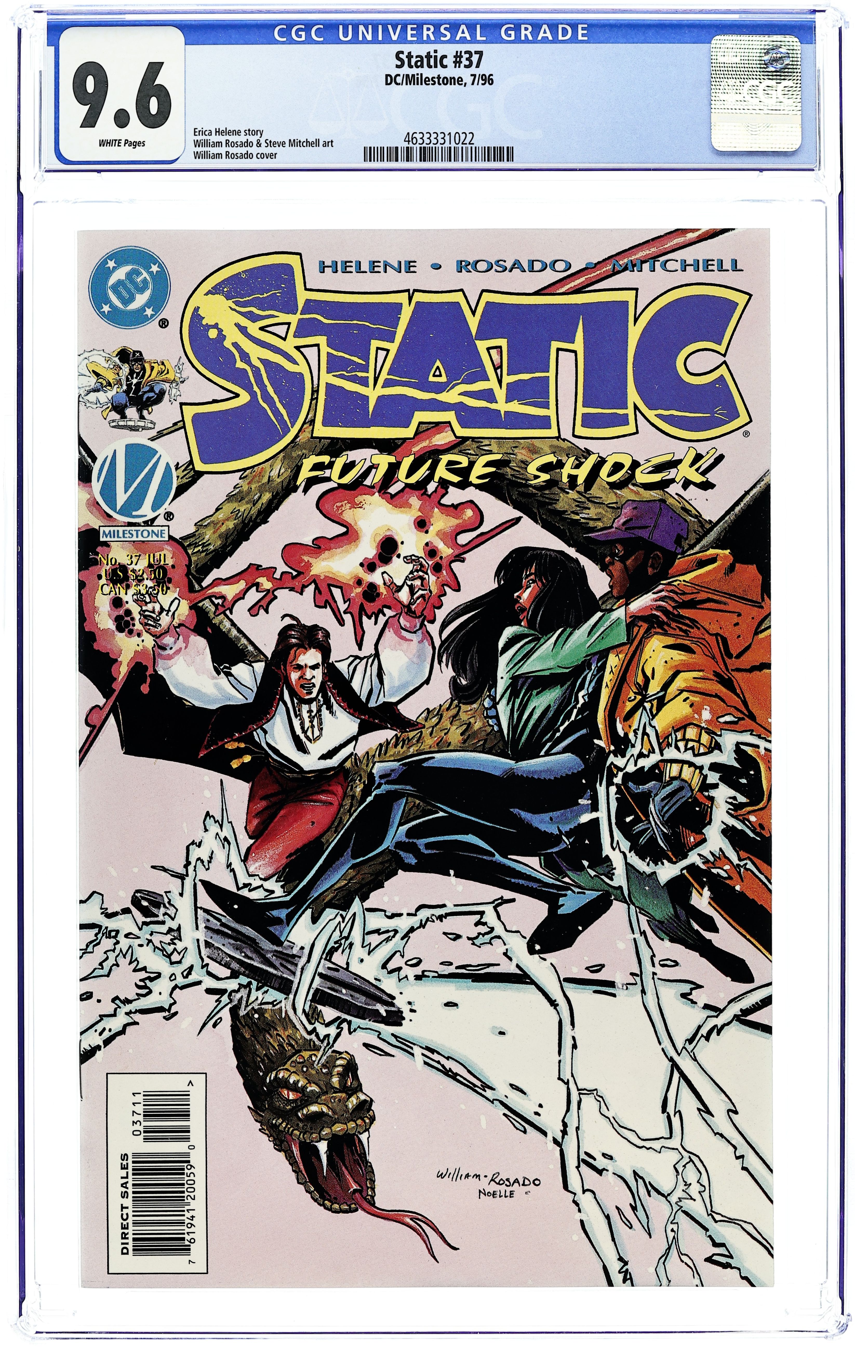 Window of Time - Written by Erica Helene. Art by William Rosado and Steve Mitchell. Cover by William Rosado. A Milestone series. Future shock! Dakota's electric crimefighter fights to help a time traveller protect the fabled Spear of Destiny from the villainous Snakefinger. Meanwhile, the truth behind Frieda's problems is revealed. Fracote Format. 32 pages, full color. Cover price $2.50.