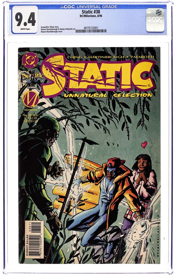 Sharon Loves Static - Written by Jackie Ching. Art by Shawn Martinbrough and Jimmy Palmiotti. Cover by Shawn Martinbrough. A Milestone series. Unnatural selection! The sinister Botanist and his army of super-plants are the least of Static's worries when Virgil Hawkins learns that his sister, Sharon, has a crush on Static. This issue is guest-pencilled by Shawn (Shadow Cabinet) Martinbrough, who also supplies the cover. Fracote Format. 32 pages, full color. Cover price $2.50.