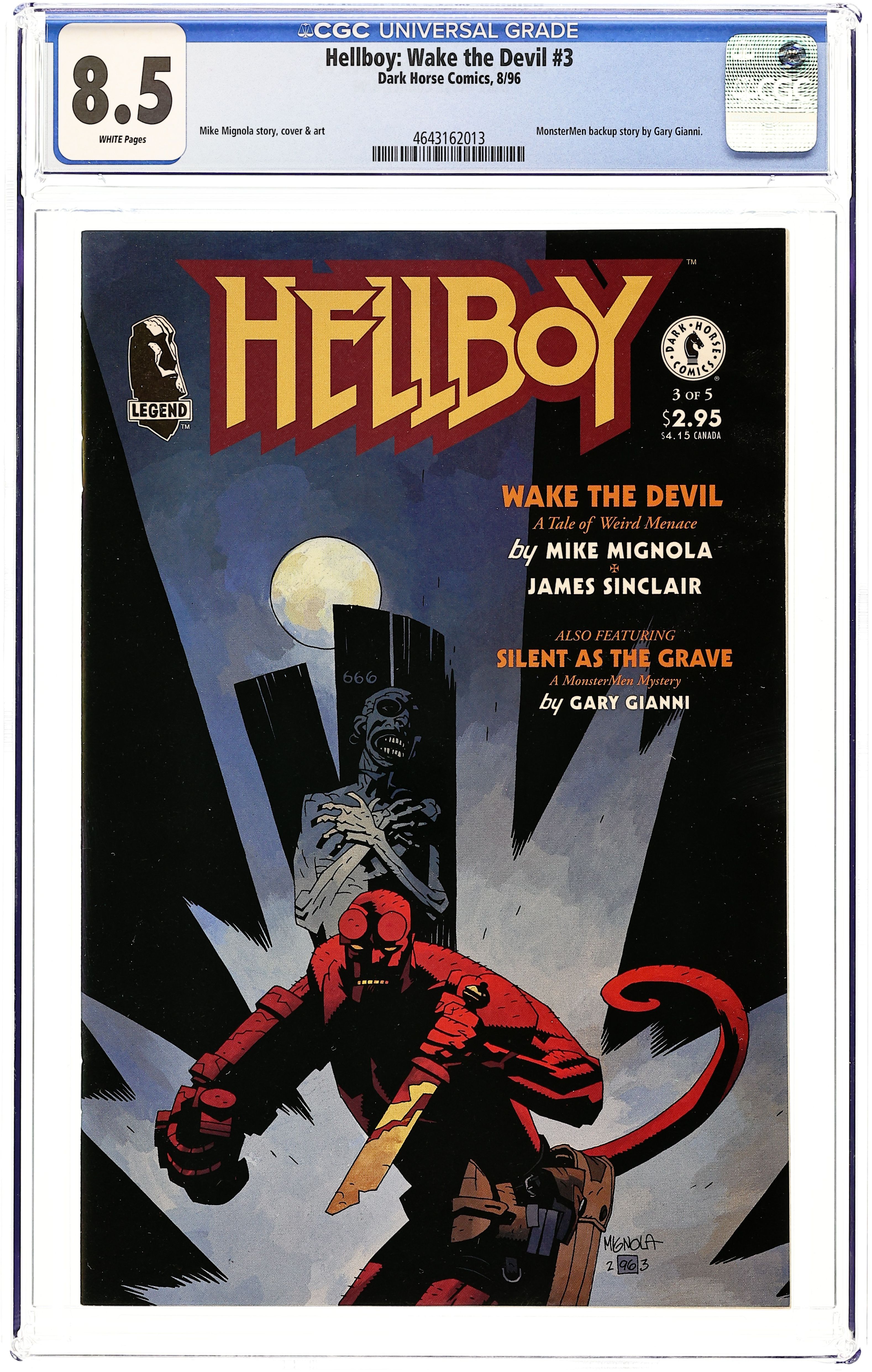 Story and art by Mike Mignola. The Devil awakens! Hellboy finds the coffin of Vladimir Giurescu just in time to see the two-hundred-year-old vampire rise from a fifty-year sleep. Outside Castle Giurescu, Rasputin initiates a new servant from the ranks of his old Nazi cohorts, and an unlucky group of Bureau agents wakes up something completely unexpected. In the back-up, Gary Gianni's MonsterMen take on a bloated gargoyle and outwit the cops, but not the press. 32 pages, FC. Cover price $2.95.