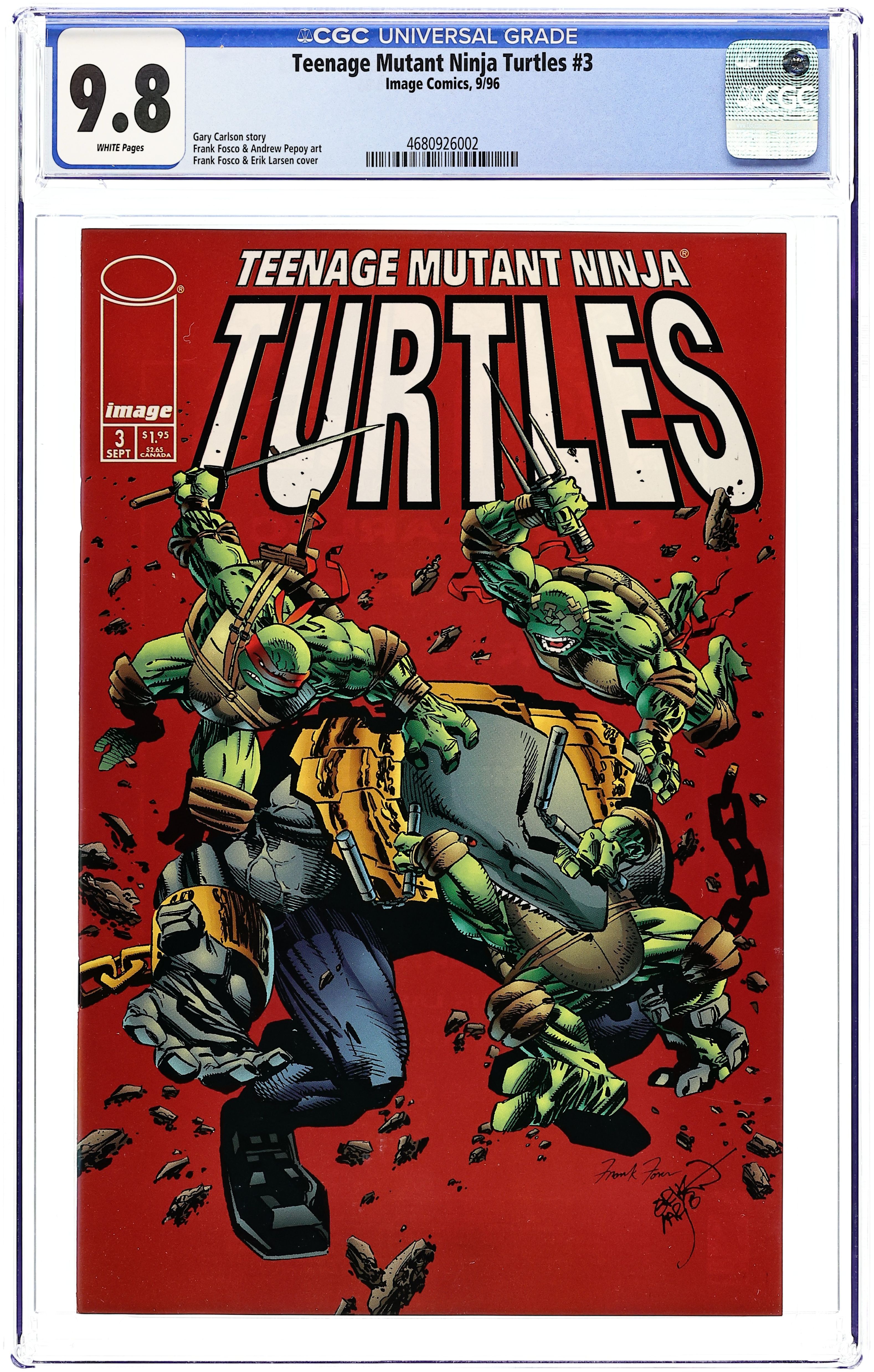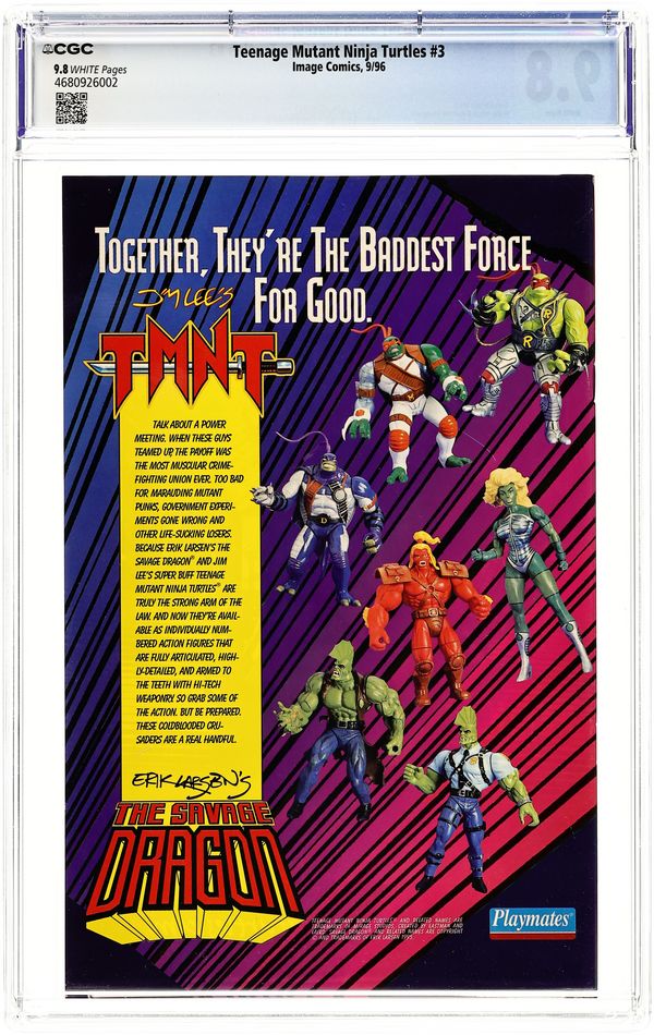 Leonardo cruises the Astral Plane, Donatello faces paralysis, and Splinter is scheduled for dissection as Warlord Komodo continues his search for the secret of the Mutagen! The action shifts into overdrive this issue as the Turtles declare all-out war against the fearsome Dragonlord, but first they must face the jaw of death when they cross paths with Savage Dragon's foe--MAKO! Written by Gary Carlson. Pencils by Frank Fosco. Cover by Frank Fosco and Erik Larsen. B/W 24 pg. Cover price $1.95.