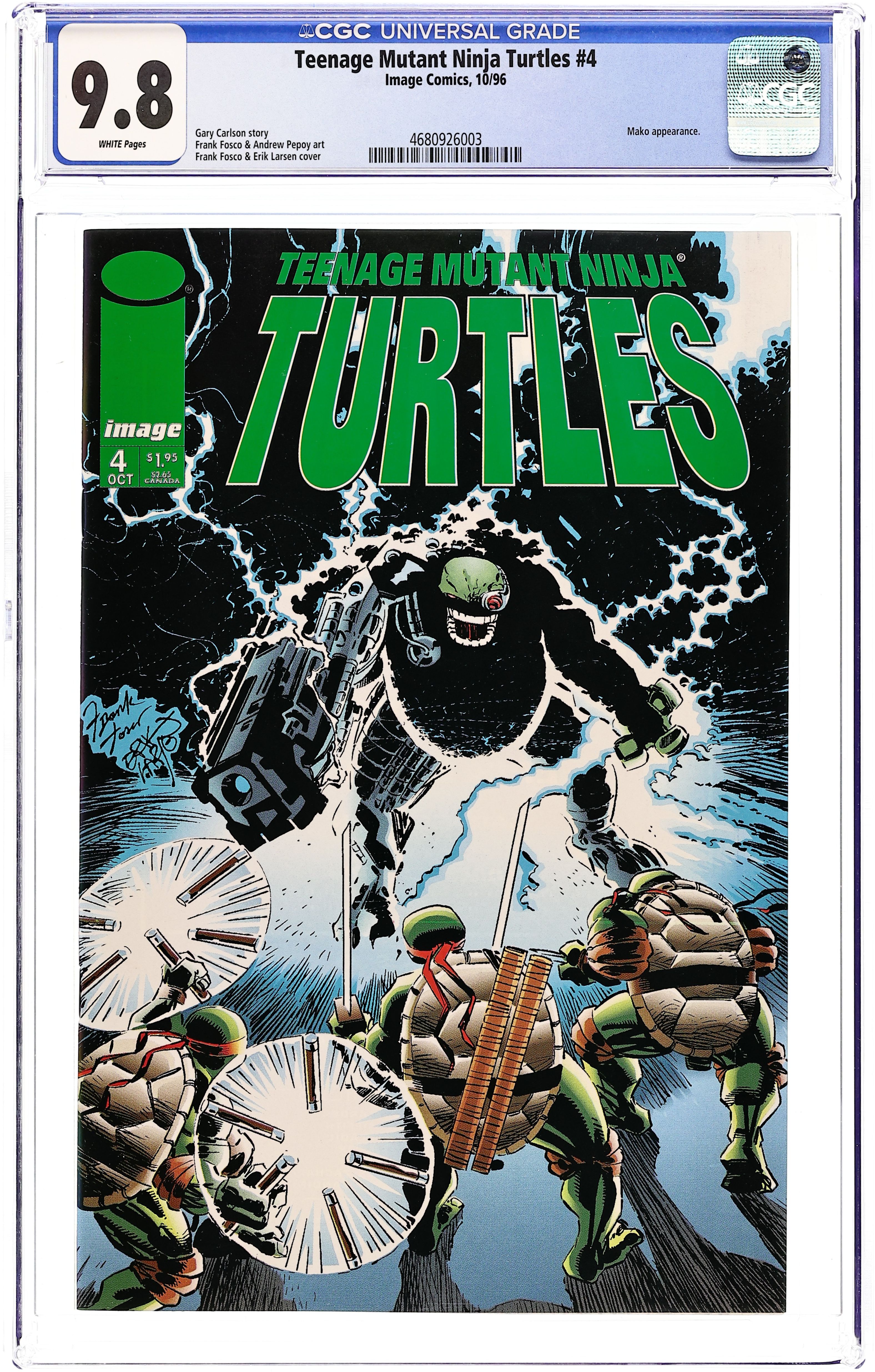 The resurrection of Donatello. Last seen paralyzed with a crushed shell, Don returns as a walking weapon, covered from head to toe with organic armor! As all out war wages between his brothers and the forces of Warlord Komodo, the most mechanically minded of the Turtles returns--as a living machine! And you'll never believe whose side he's on! Written by Gary Carlson. Pencils by Frank Fosco. Cover by Frank Fosco and Erik Larsen. B/W 24 pg. Cover price $1.95.