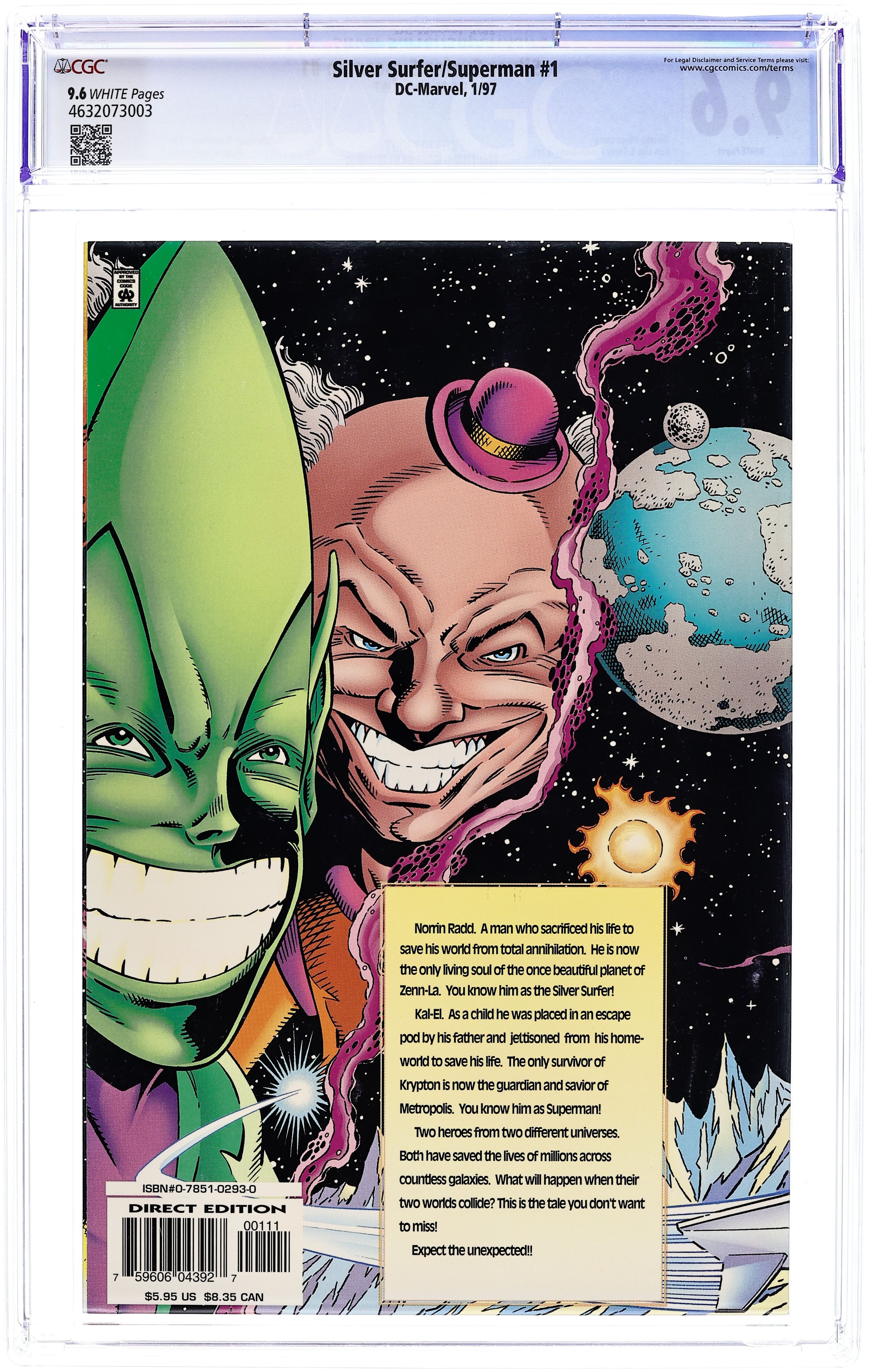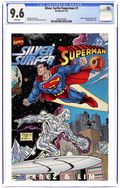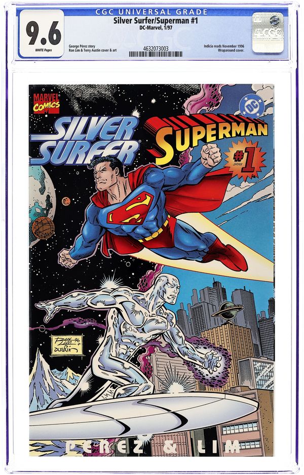 Marvel's Star-Soarer meets DC's Man of Steel! One lost Krypton, a planet destroyed soon after his birth. The other lost his humanity to save Zenn-La, a planet he would never know again. They won't lose another world! It's a 48-page crossover of cosmic proportions! Written by George Perez. Art and wraparound cover by Ron Lim and Terry Austin. Cover price $5.95.