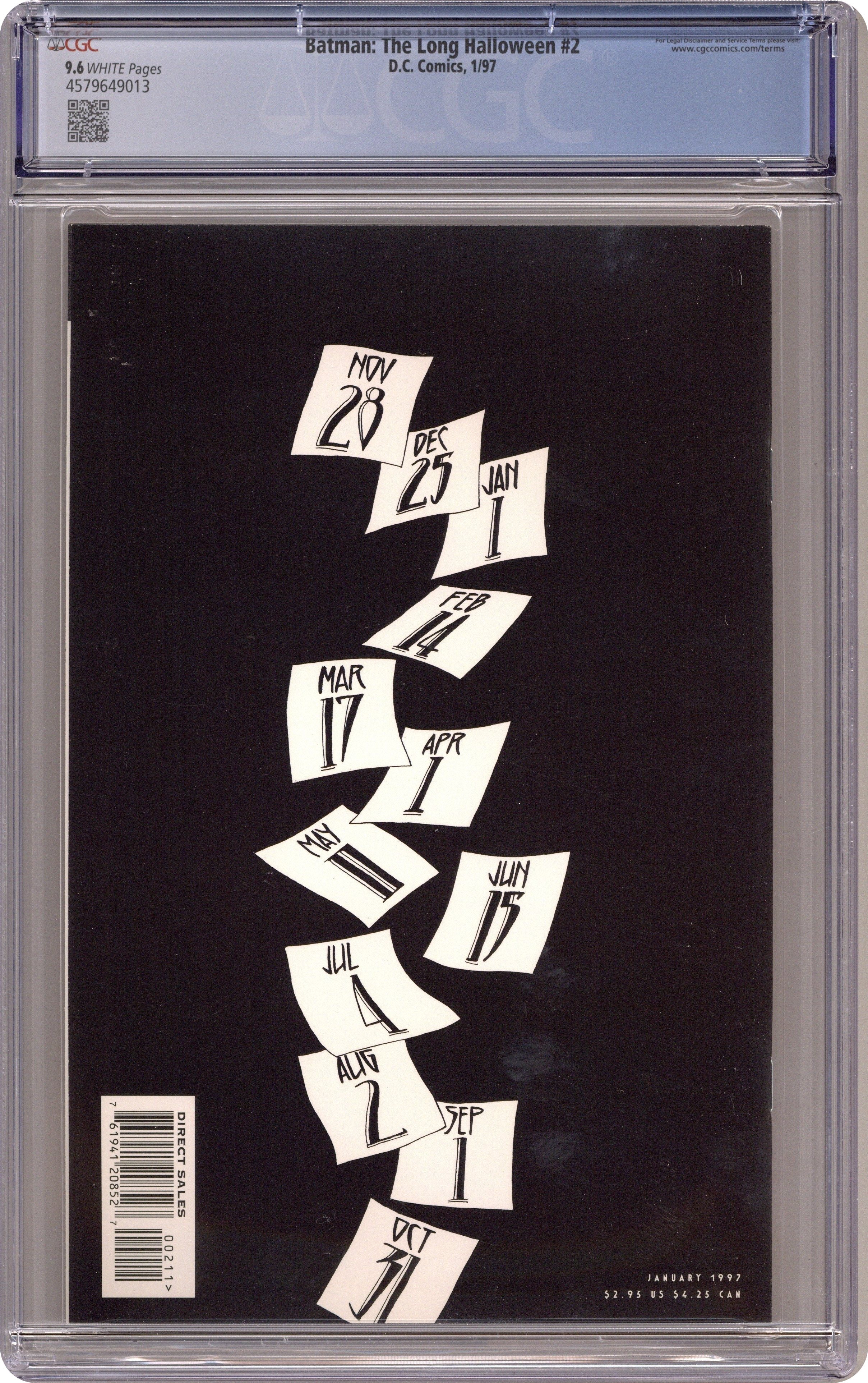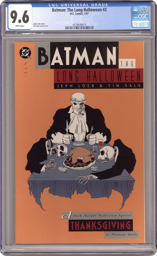 "Thanksgiving." Batman tries to figure out who planted a nail-enhanced bomb in Harvey Dent's house. Includes appearance by Solomon Grundy. Script by Jeph Loeb, art and cover by Tim Sale. Cover price $2.95.